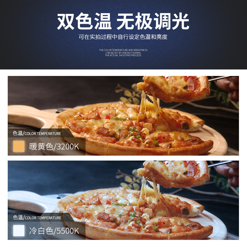 Standard white light (5500k 200k 200k or 5600K 5600K 200K) warm light (2700K-3500K) adjustable colour temperature
