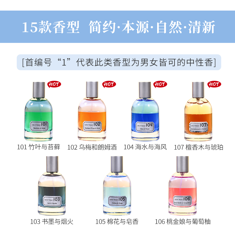 101 Bamboo leaves and moss 102 Dark plum and rum 103 Book ink and fireworks 104 Sea water and sea breeze 105 Cotton and soap fragrance 106 Myrtle and grapefruit 107 Sandalwood and amber
