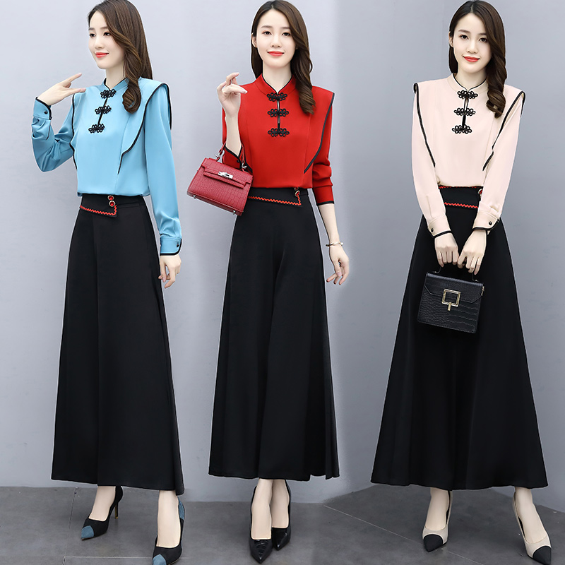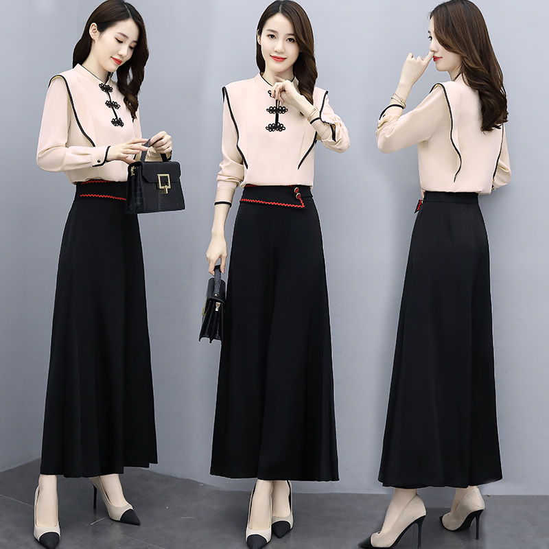 China Wind Retro Suits 2022 New Women's Fall Fashion temperament Name Yuanyuan Gas Aging Broadlegged Pants Two Sets