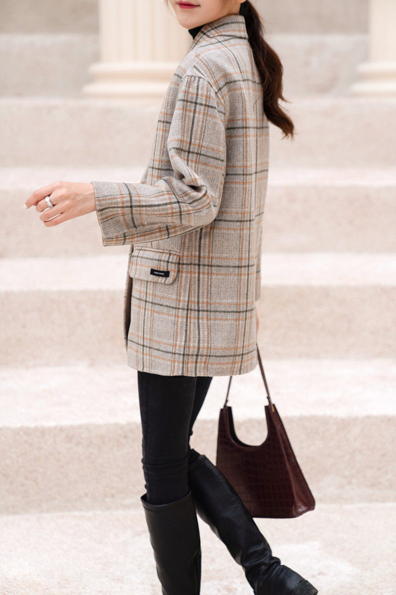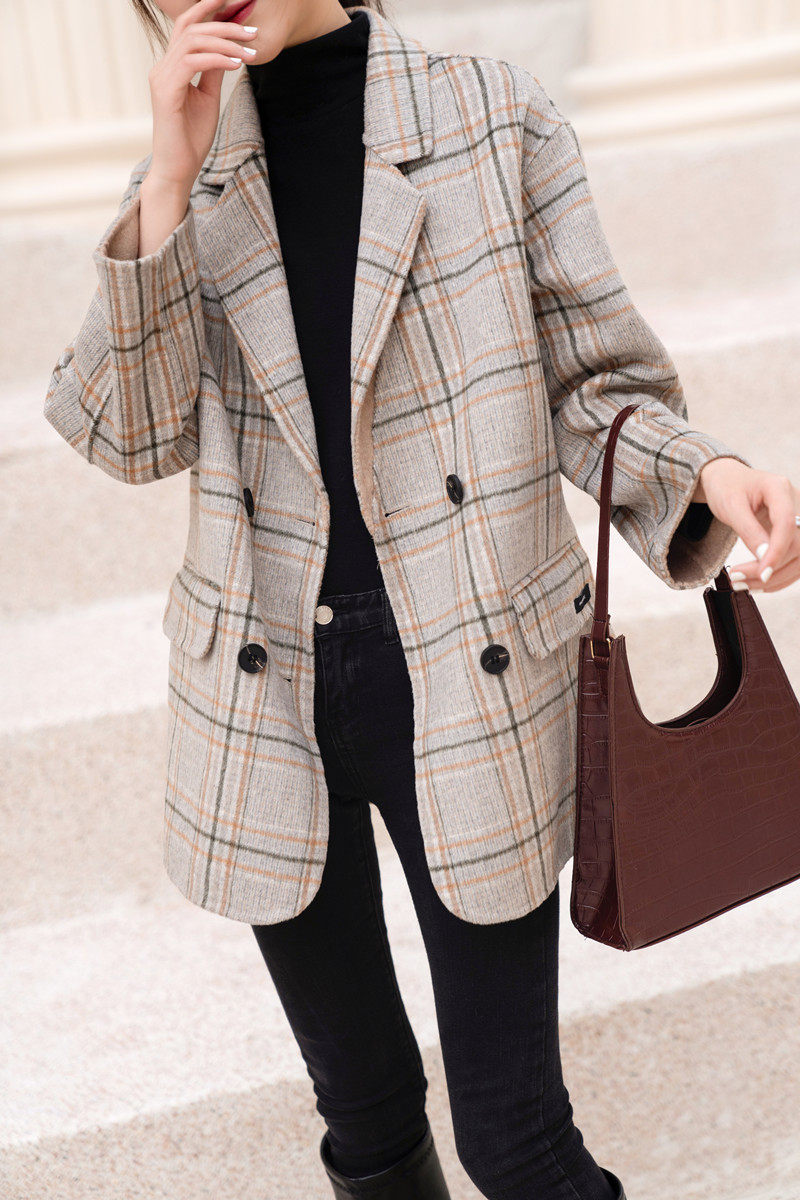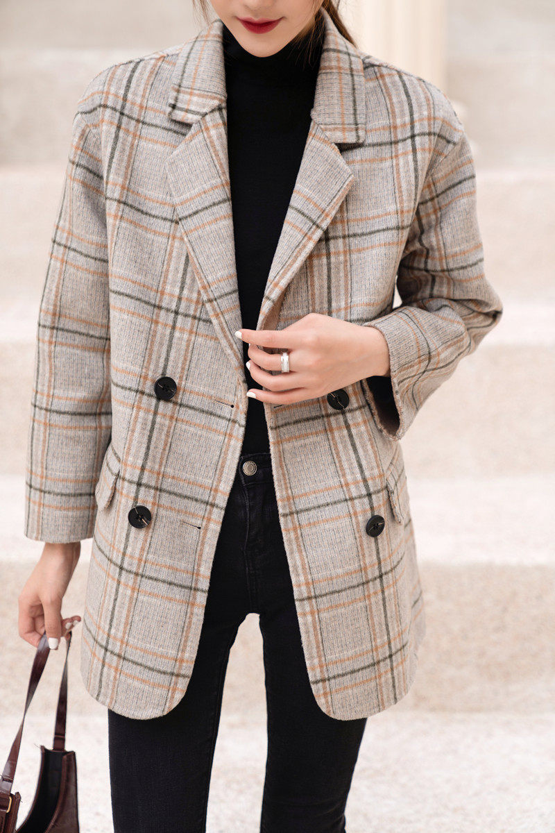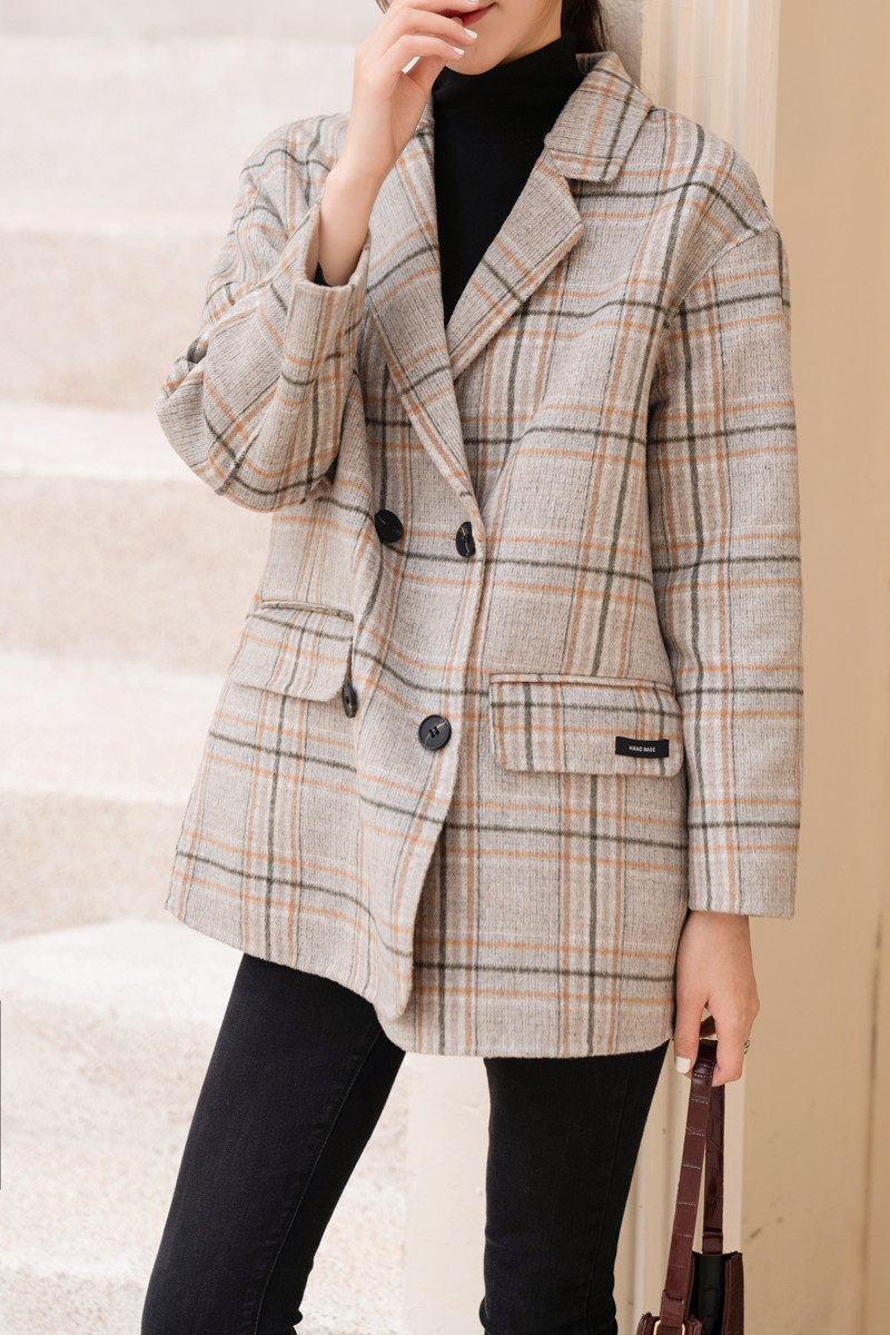 South Korean high-end milky tea colour bifacial cashmere big coat woman short autumn and winter double-row button plaid suit fur coat