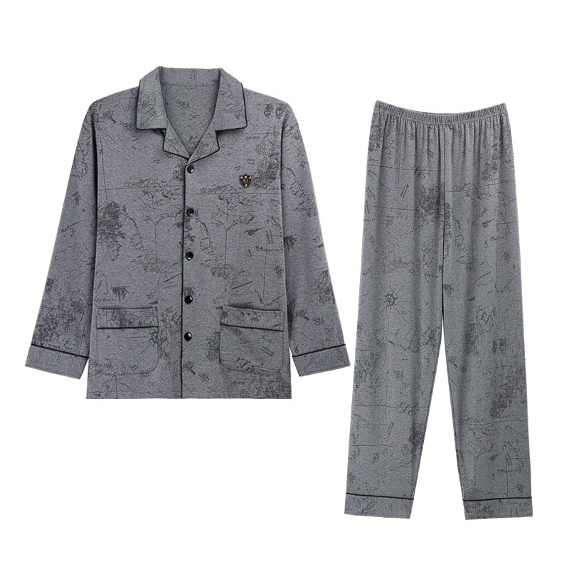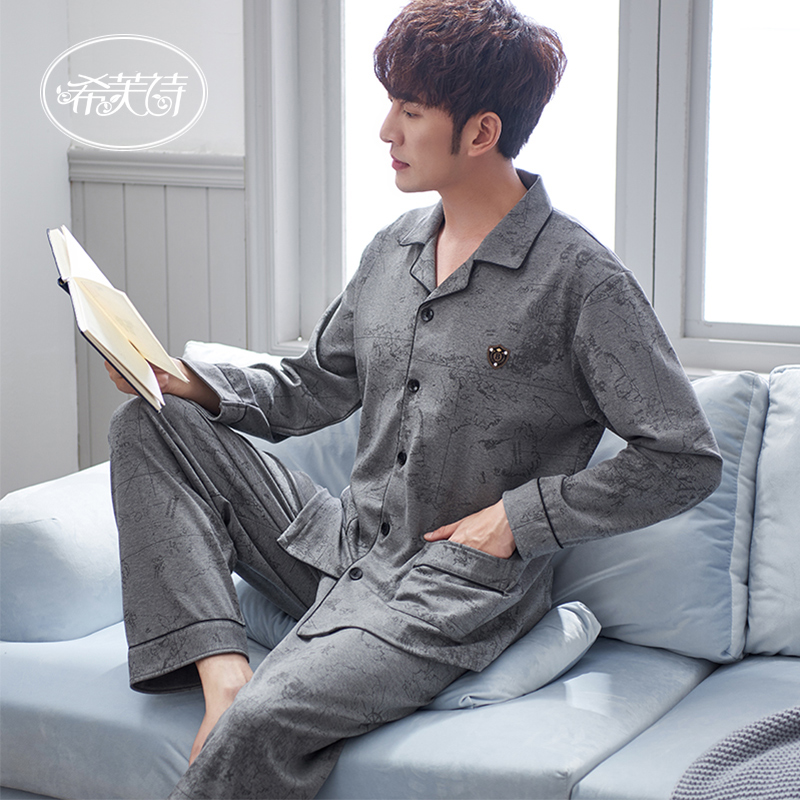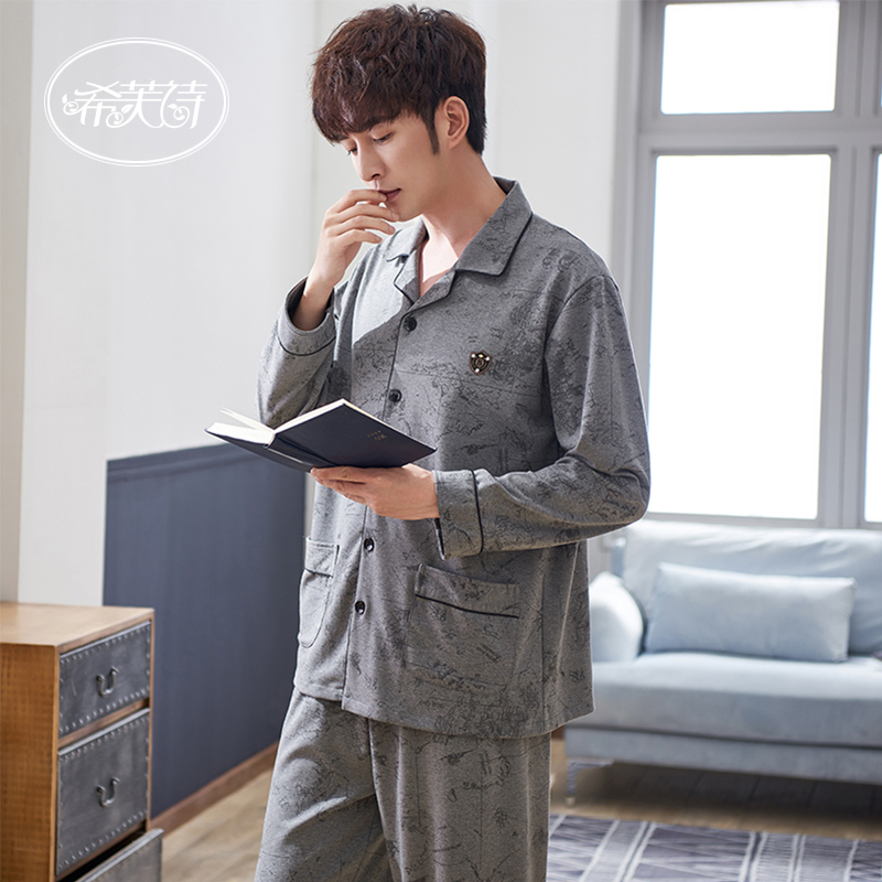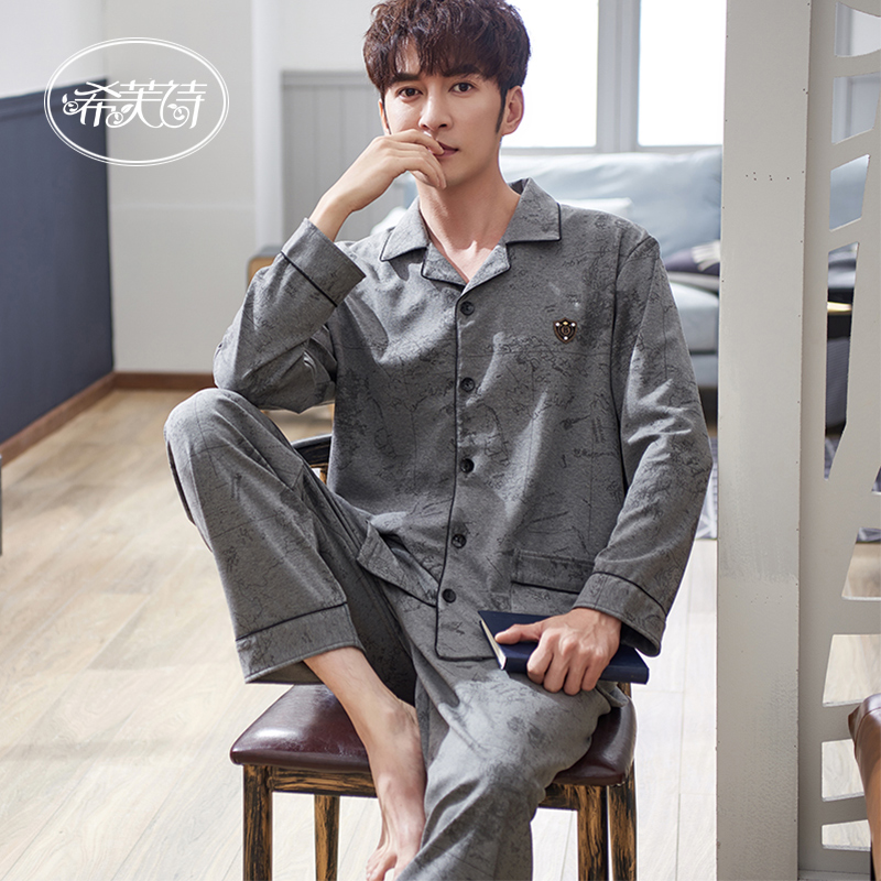 Shiv Poetry Men Sleeping Clothes Han Edition Pure Cotton Youth Spring Autumn Money Grey Retro Long Sleeve Home Suit Sleep Suit Summer