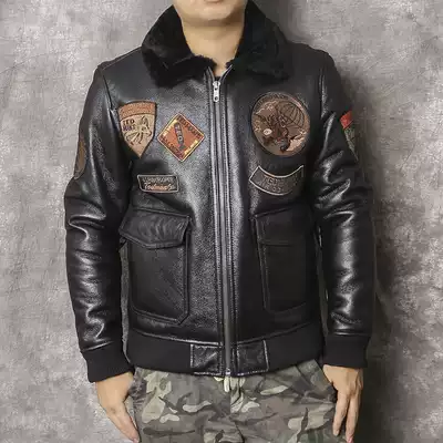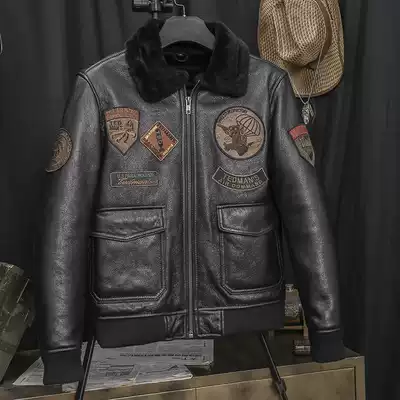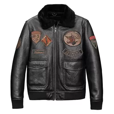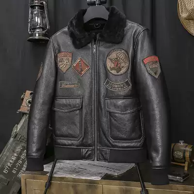 New aviator sheepskin wool one-piece jacket short lapel embroidered leather leather jacket men's winter fur jacket