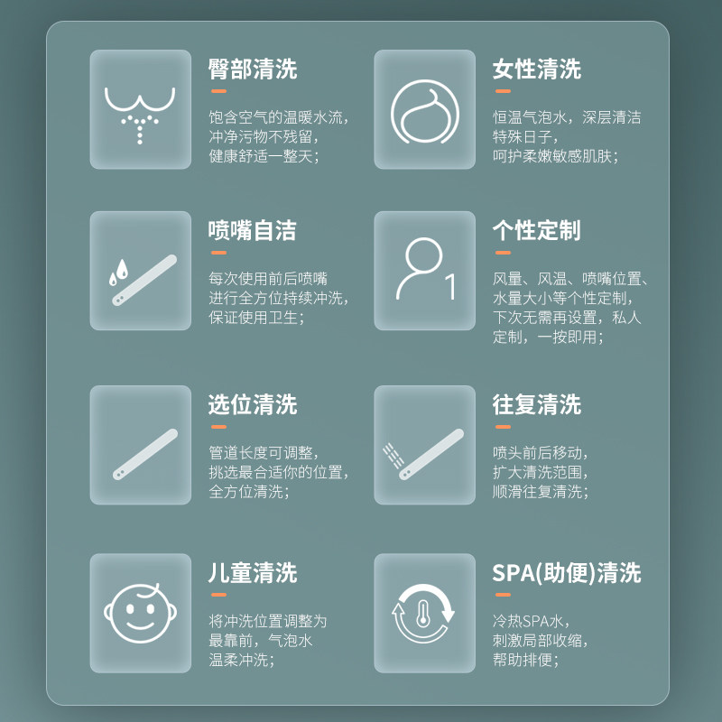 Instant heat type buttock cleaning Female cleaning Seat heating water temperature adjustment Water pressure adjustment Warm air drying Automatic deodorant nozzle mobile cleaning