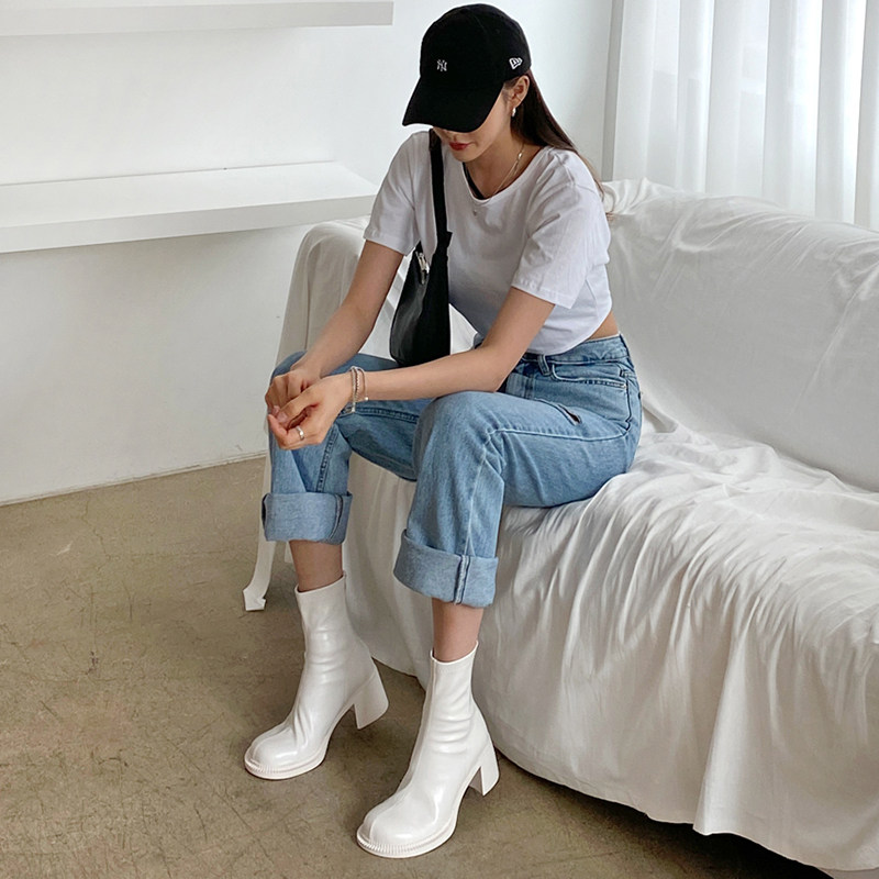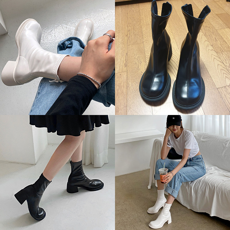 Large head elastic high heel short boot female 2022 coarse heel round head rear pull chain 100 lap Chelsea Korean version Martin boots