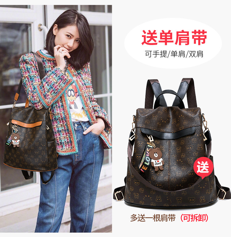 Tide brand leather back backpack women's bag new bear bag all-match large backpack school bag anti-theft diagonal travel bag