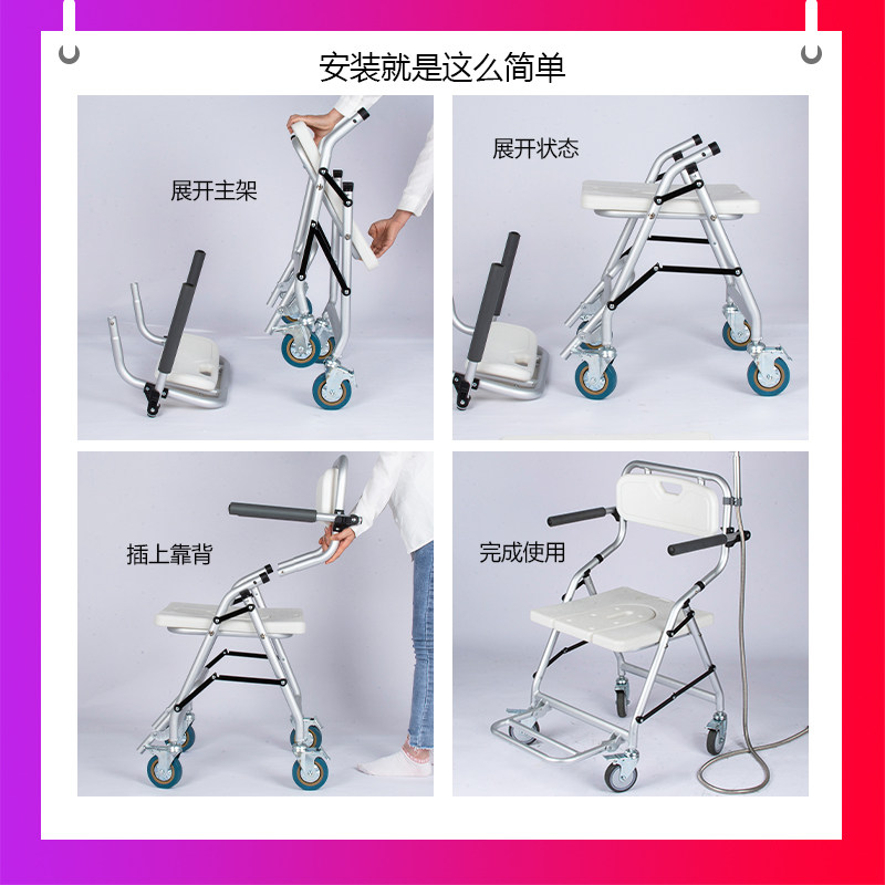 Foldable wheeled chair for the physically and mentally handicapped, toilet seat for the elderly, shower special chair for the elderly, toilet seat for the elderly