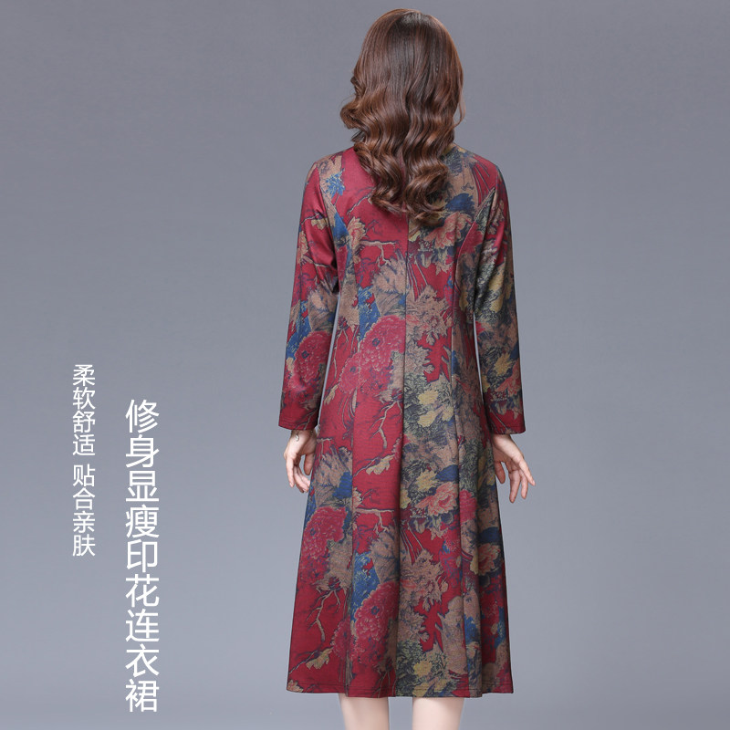 2021 spring new fashion V-neck age reduction printing middle-aged mom long-sleeved slim slim mid-length dress