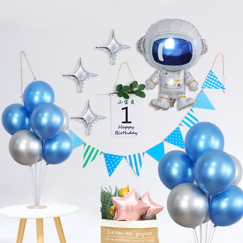 10 garnet red balloons (one black and one red set into a balloon) Colored cloud package Colored rocket package Pink cloud package Pink crown package Blue Astronaut Package