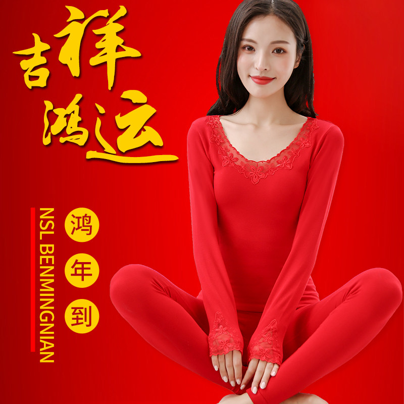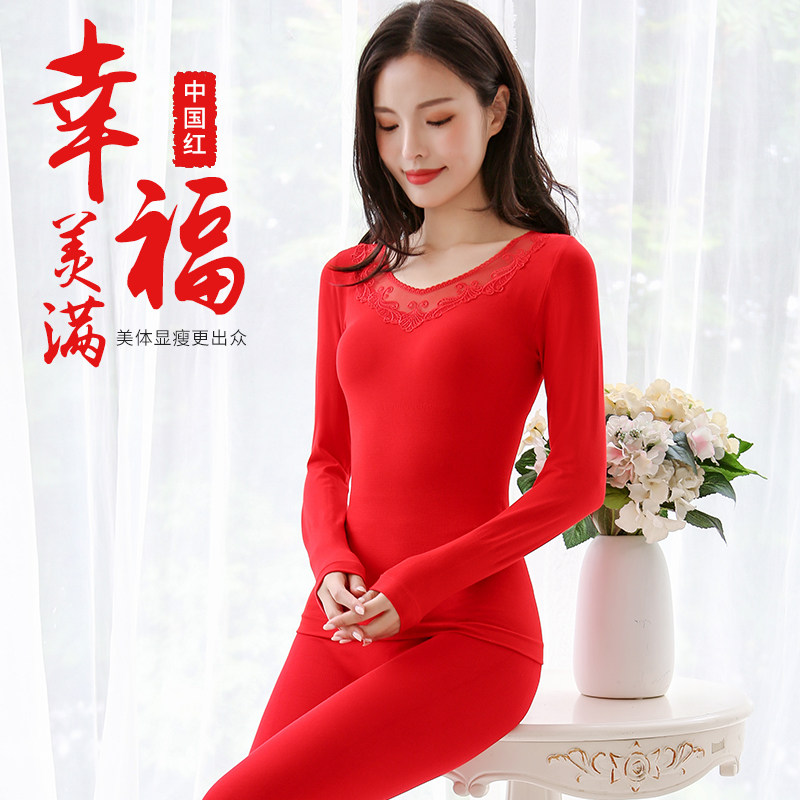 Benming year underwear suit ladies big red autumn clothes sanitary pants body slim thin section bridal wedding heating clothes