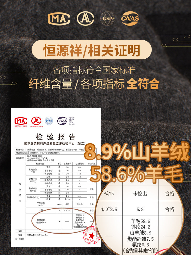 Wool 58 6% polyamide fiber (nylon) 24 2% Mountain cashmere (cashmere) 8 9% polyester fiber 7 5% polyurethane elastic fiber (spandex) 0 8%