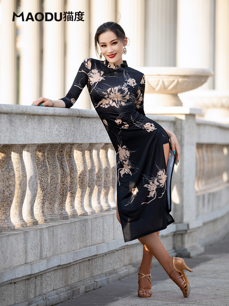 Cat-degree Latin dance printed double switch fork qipao Chinese wind print black dance Latin qipao double switch fork elastic