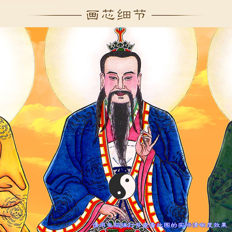 Three Qing Dynasty Tianzun ancestral portrait Yuan Shi Moral Tianzun Taishang Laojun Scroll hanging painting Full screen silk cloth Land and water painting