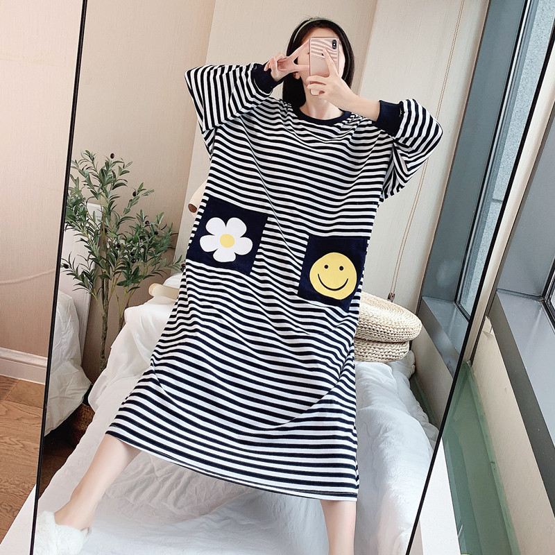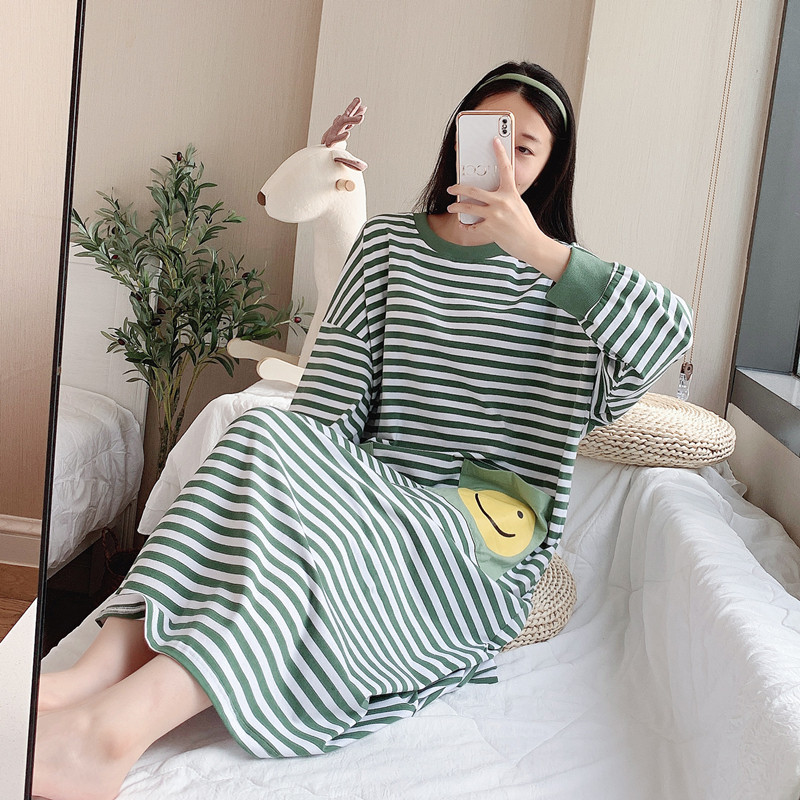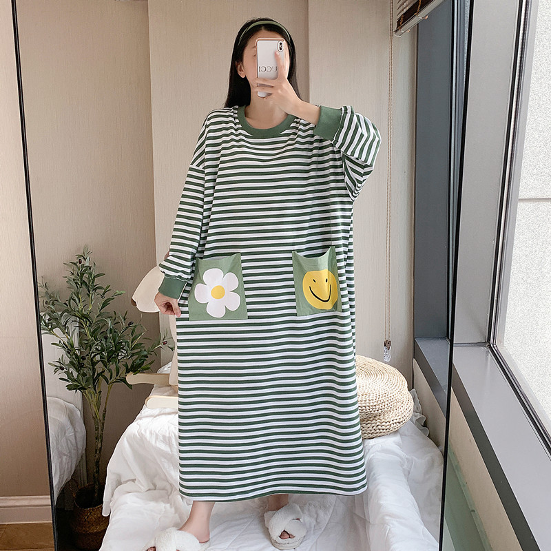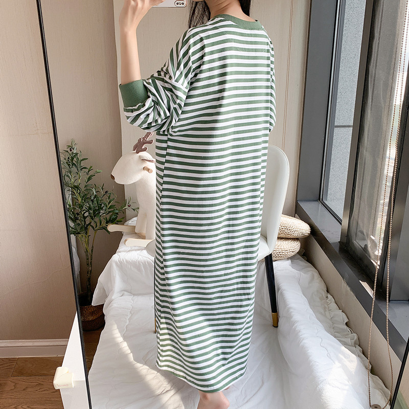 Striped nightdress women's spring and autumn long-sleeved cotton cute home clothes loose plus fertilizer plus size long version pregnant women's pajamas
