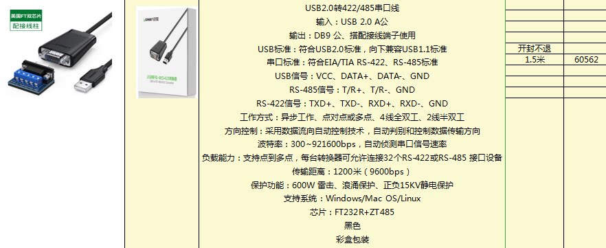 Green Union usb turn rs485 422 computer interface nine-pin serial port data line industrial grade transfer communication module