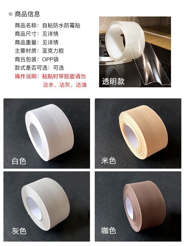 White anti-mildew tape -3.8cm width * 3.2 meters long Gray anti-mildew tape - 3.8cm width * 3.2 meters long Coffee color anti-mildew tape - 3 .8cm width * 3.2 meters long Beige anti-mildew tape - 3.8cm width * 3.2 meters long Pure transparent moldproof tape - 3cm wide * 3 meters long Pure transparent mildew tape - 5cm wide * 3 meters long Pure transparent moldproof tape - 3cm wide * 5 meters long Pure transparent moldproof tape - 5cm wide * 5 meters long Pure transparent moldproof tape - 3cm wide * 10 meters long Pure transparent anti-mildew tape - 5cm wide * 10 meters long