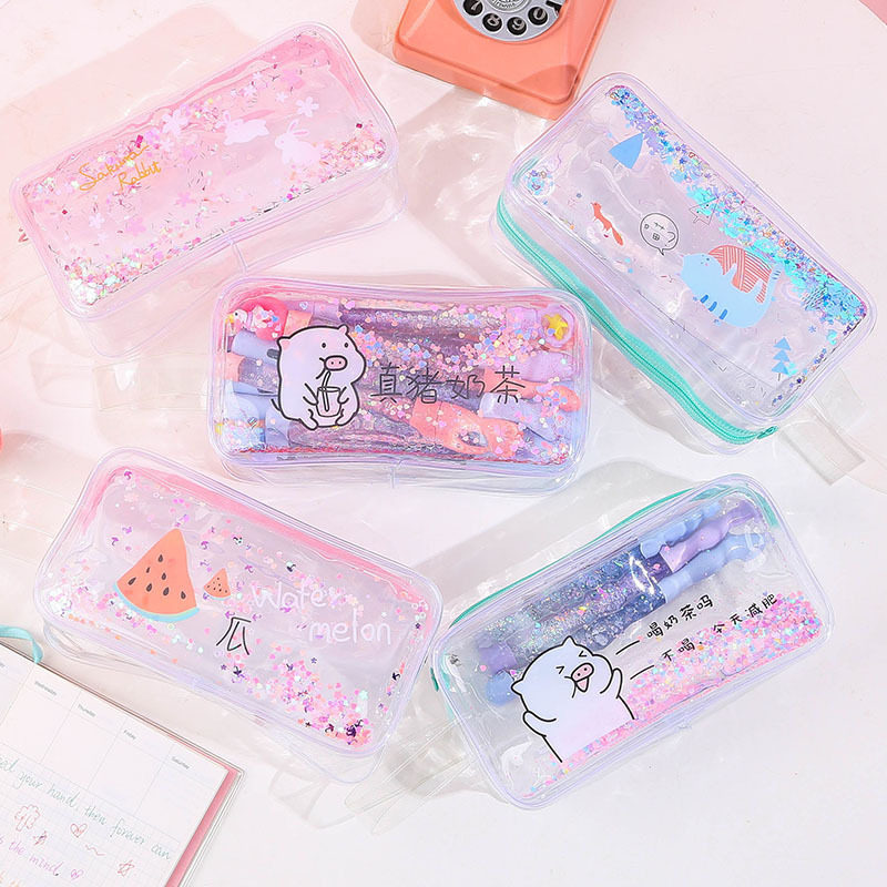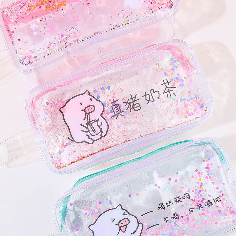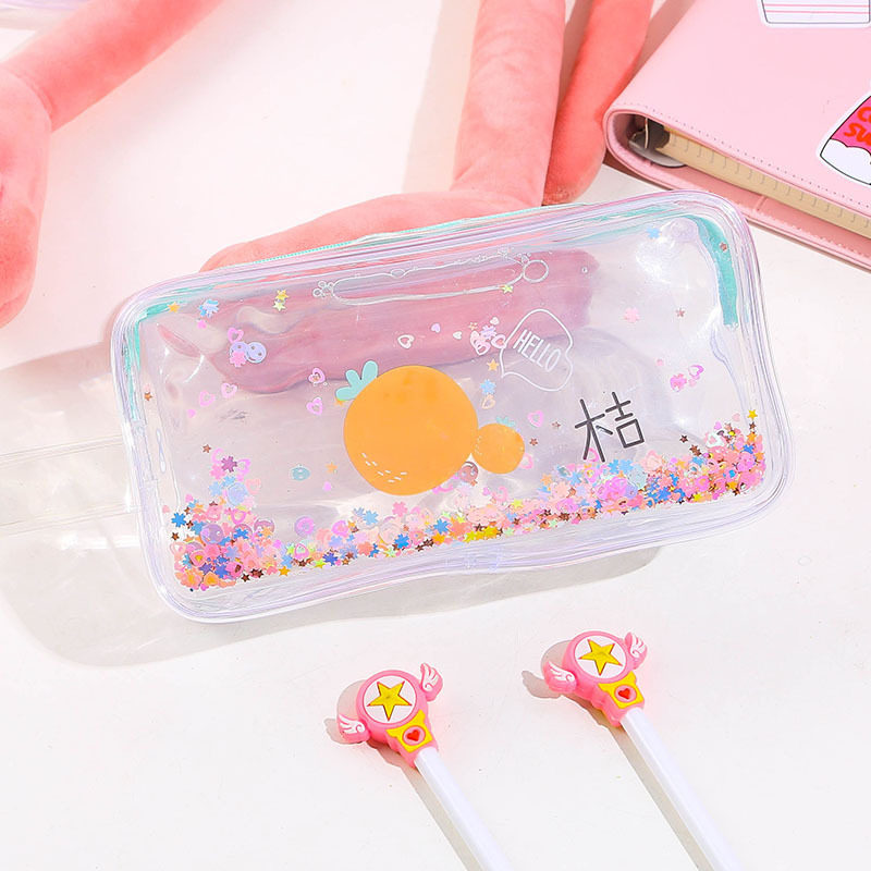 Han Edition Teenage Girl Hearts Into Oil Flow Sand PVC Transparent Pen Bag Cartoon Cute Large Capacity Student Containing Bag Makeup Bag