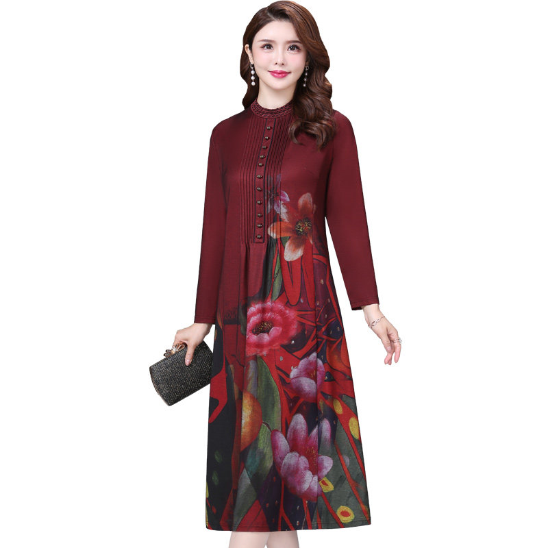 2021 new item middle-aged mother spring and autumn retro printing long-sleeved middle-length western air age-reducing thin dress female
