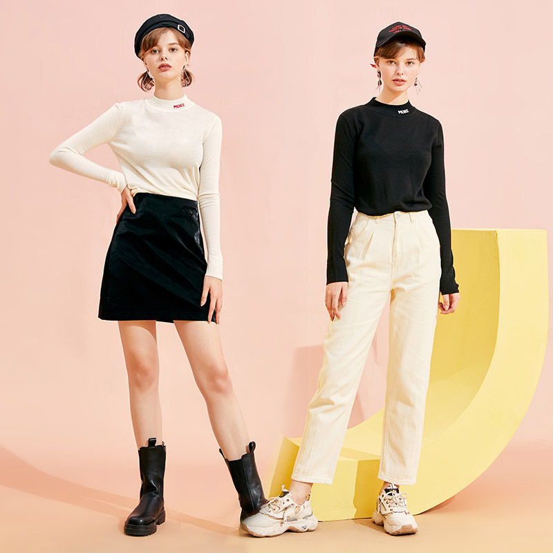Jamor Spring-autumn new minimalist pure color sweet and white undershirt with slim and half high round collar-knitted sweatshirt