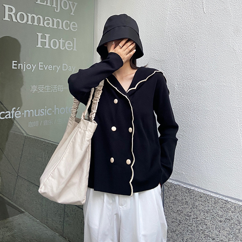 Grey-fried with retro-vintage gentle and lazy style Lazy Wind Double-Row Buttoned Loose Needle Weaselwear Navy sweater Long sleeve blouse Women Fall