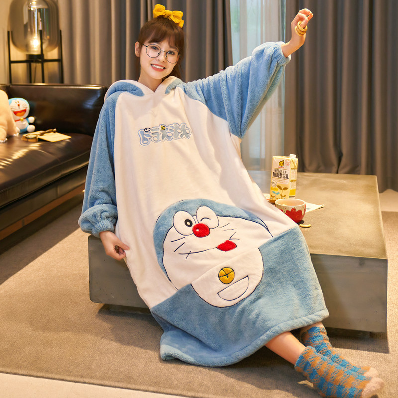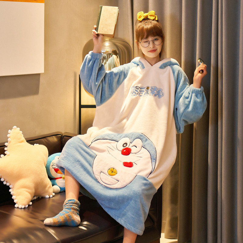 Thick coral fleece nightdress female autumn and winter long version plus velvet cute cartoon cat loose large size pajamas flannel fat mm