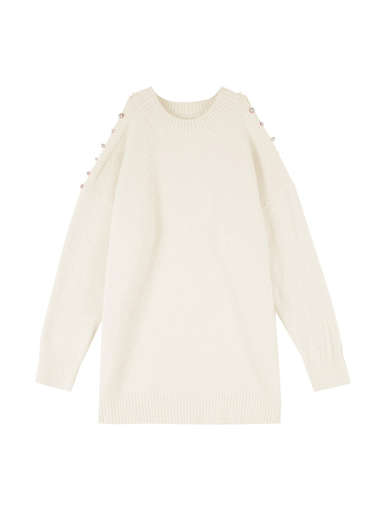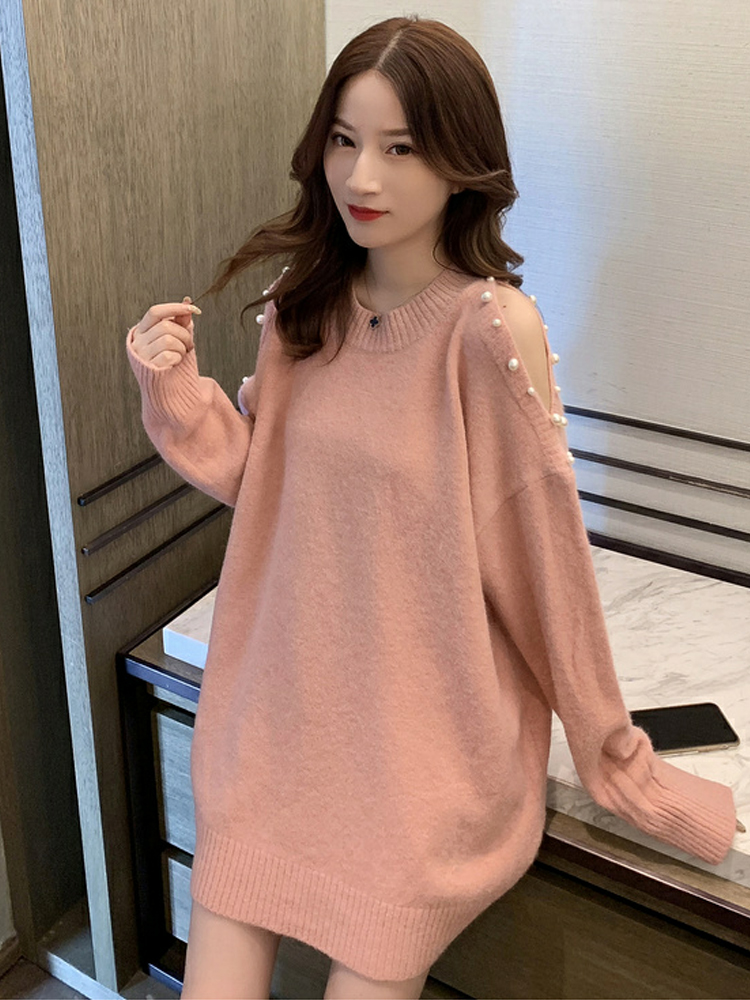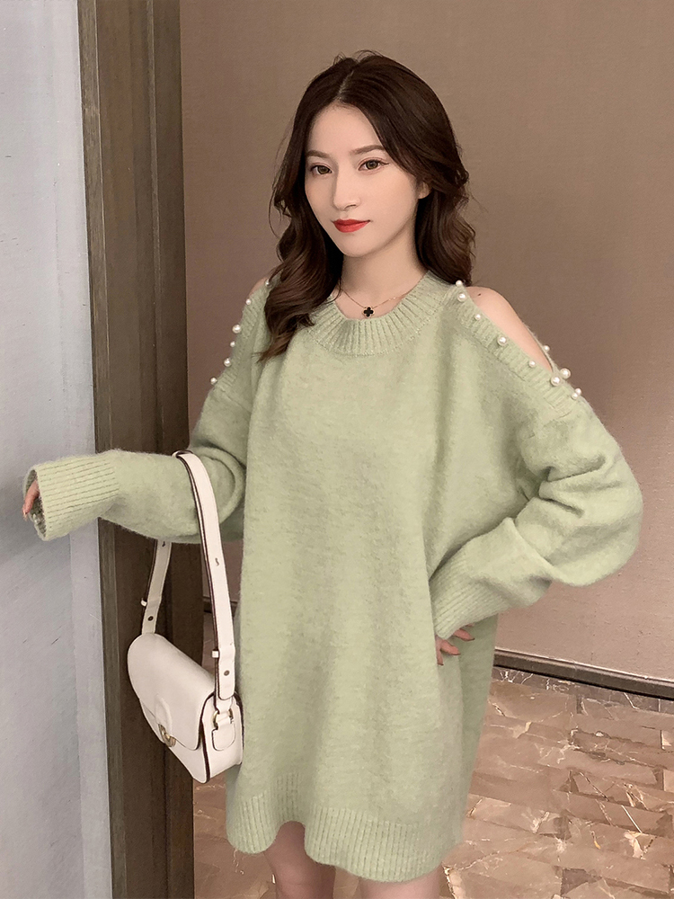 Loose LAZY WIND MEDIUM LONG VERSION SEXY DEW SHOULDER KNIT FOREIGN DRESS LADY AUTUMN WINTER SMALL CROWD DESIGN SWEATER OUTWEAR WAVE