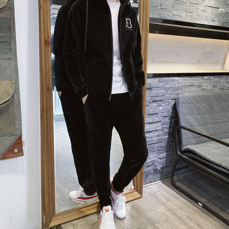 Fugui bird gold velvet sports suit men's autumn winter new Korean version trend thickened large size casual thick cotton two-piece set
