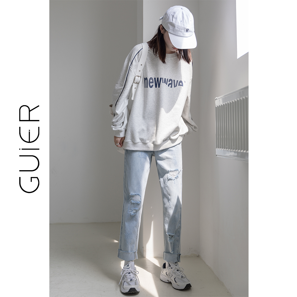 "GUIER" cuffed ripped jeans women's 2021 new autumn high-waisted thin straight-leg nine-point pants