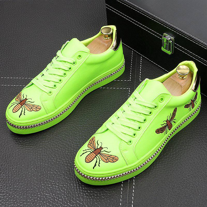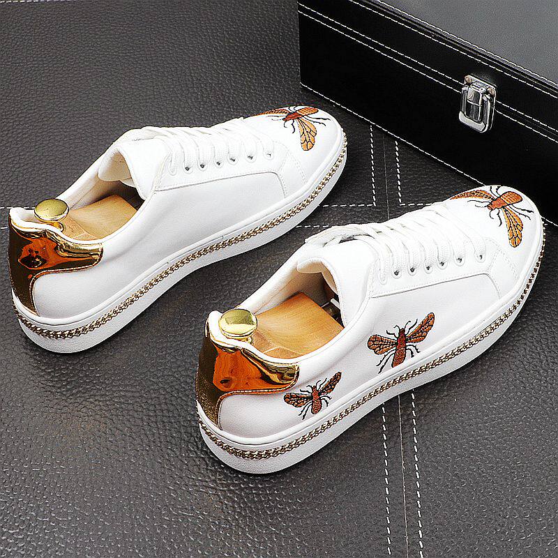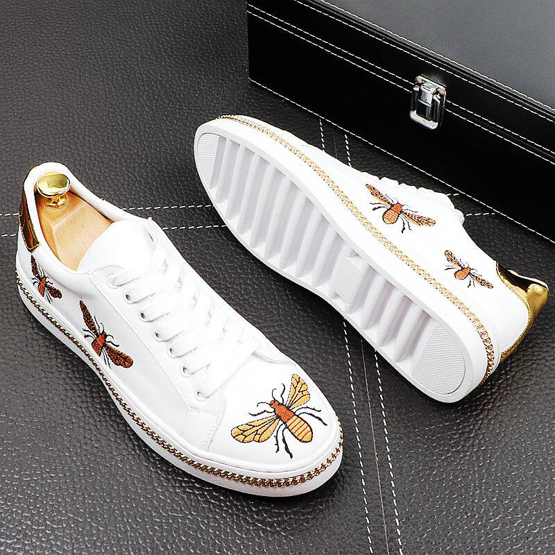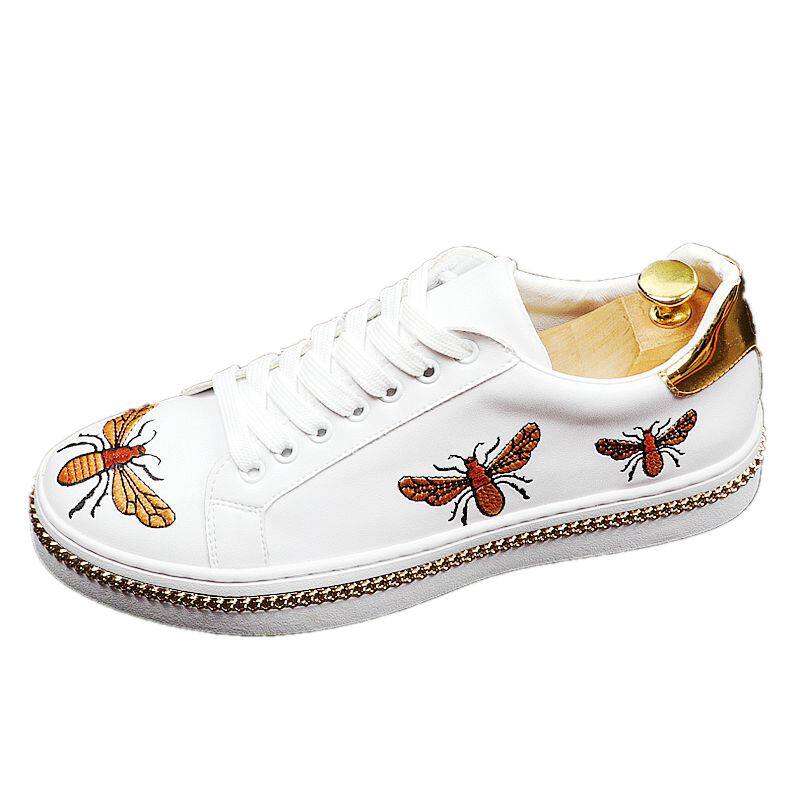 Little Bee White Shoes Men's Leather Breathable Personality Embroidered Sneakers Men's Casual All-match White Internal Orgasm Shoes