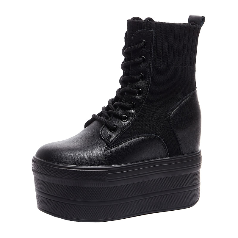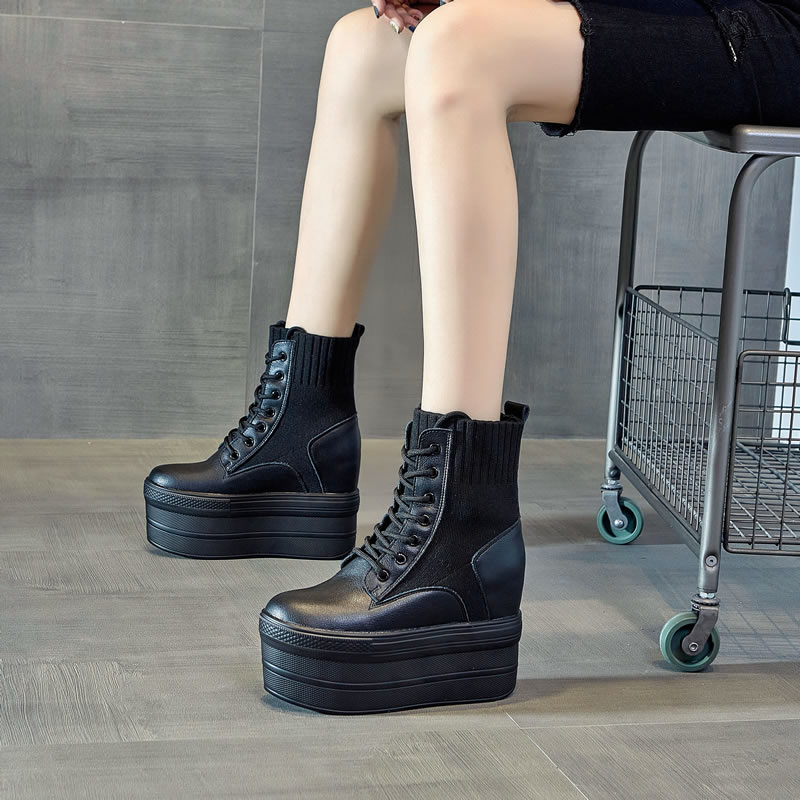Black Nets heightening Martin boots female spring ultra high heel Inron wind sock boots Thin Pine pastry Thick Bottom Short Boots 12cm