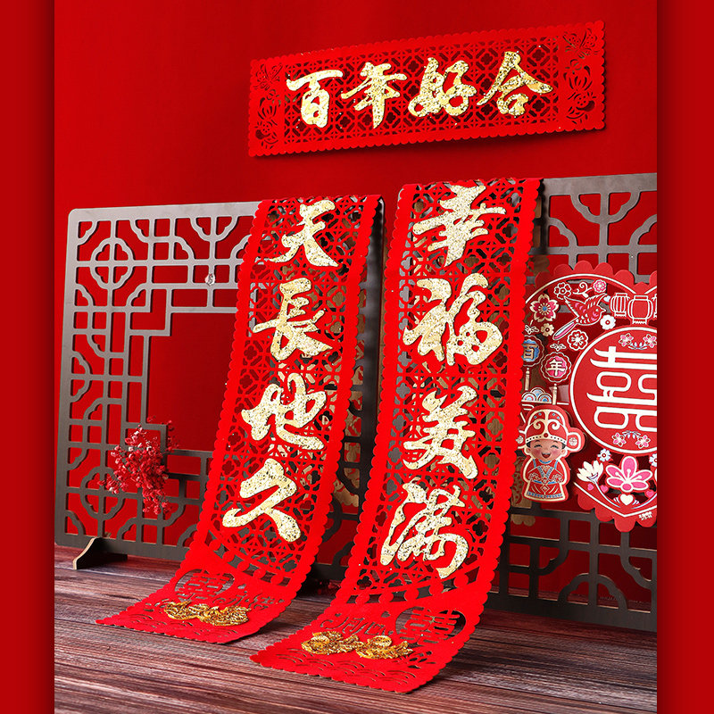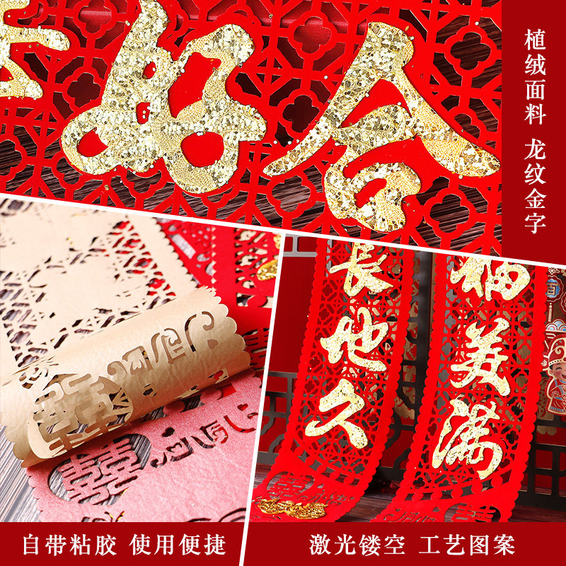 Chinese style wedding couplets Flannel hollow dragon pattern Jinxi couplet Three-dimensional self-adhesive happy words Wedding room decoration