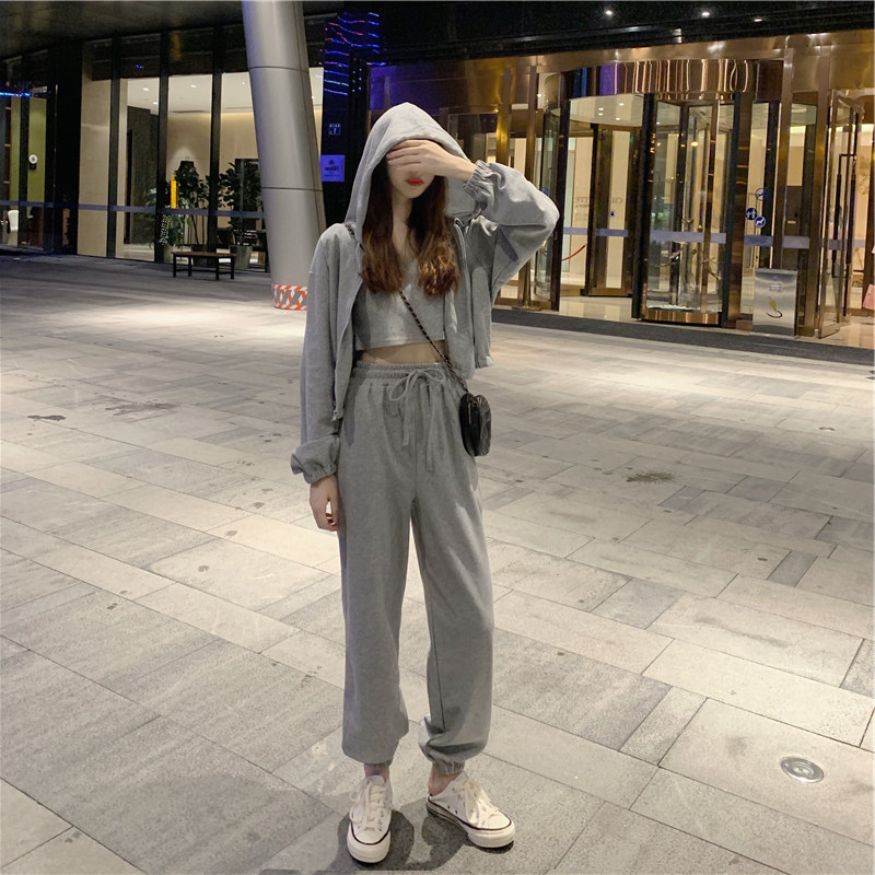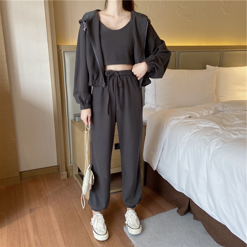 ins super fire suit female autumn and winter Korean version of the short version of the sweater coat small sling casual sports pants Western style three-piece set