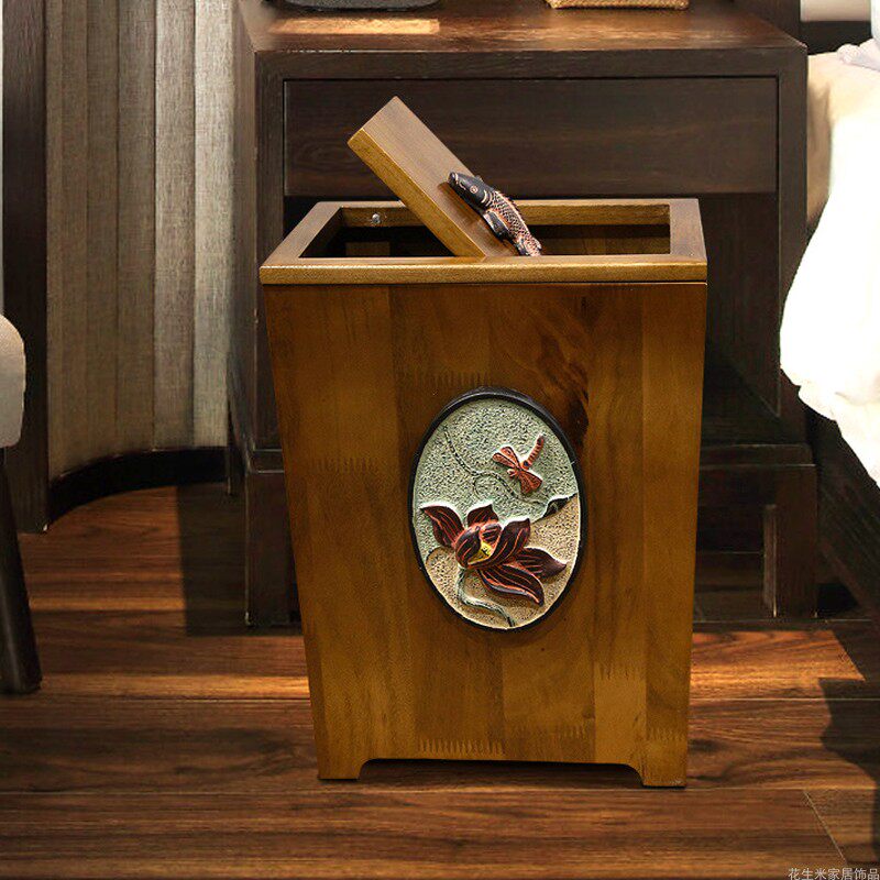 Solid wood Chinese trash can floor-to-ceiling large living room retro press-type classical storage bucket shake cover office paper basket