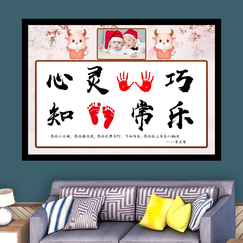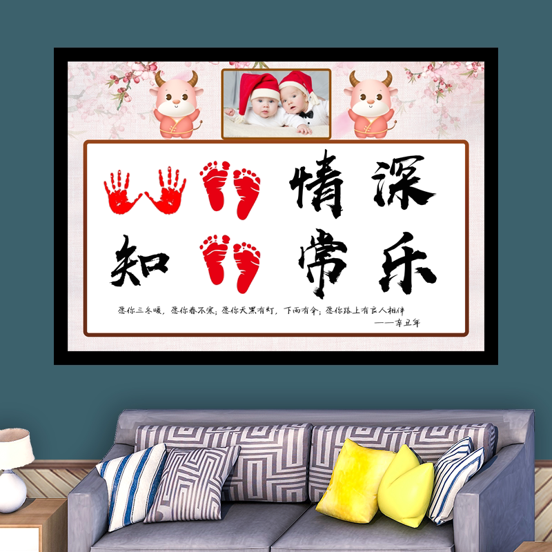 Palm Pearl Chinese calligraphy and foot print photo to remember the baby's full moon, gift shake and calligraphy know the full time