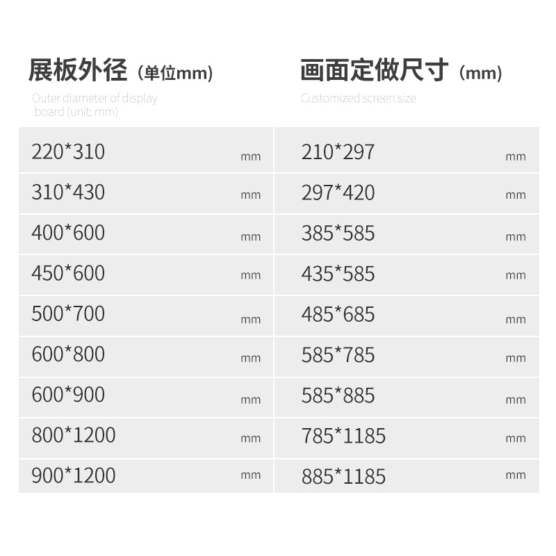 (A4)220*310mm(A3)310*430mm400*600mm450*600mm500*700mm600*800mm600*900mm600*1200mm800*1200mm(two pieces) 900*1200mm(two pieces) Customized size (ten pieces minimum)