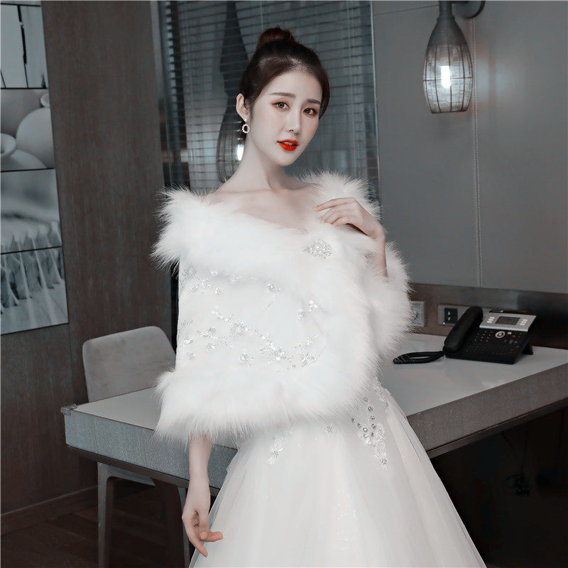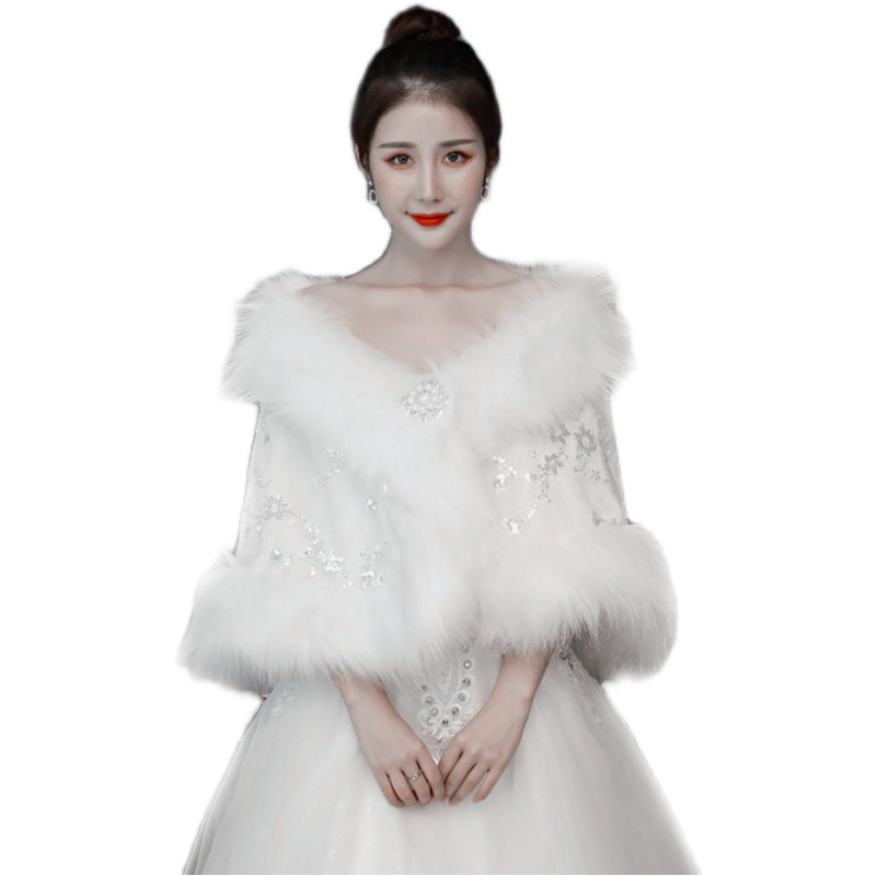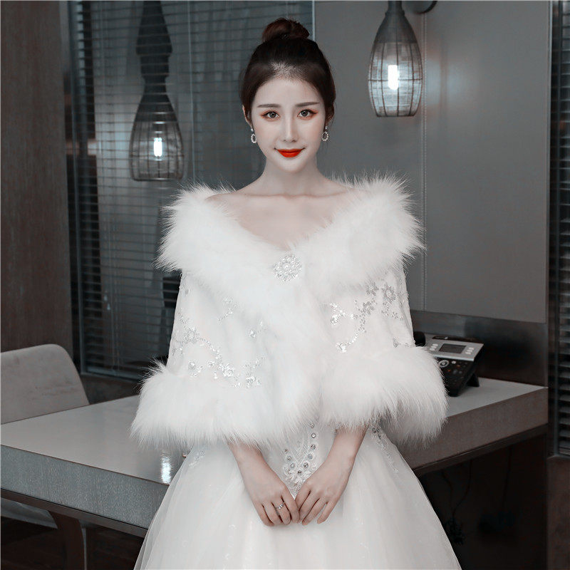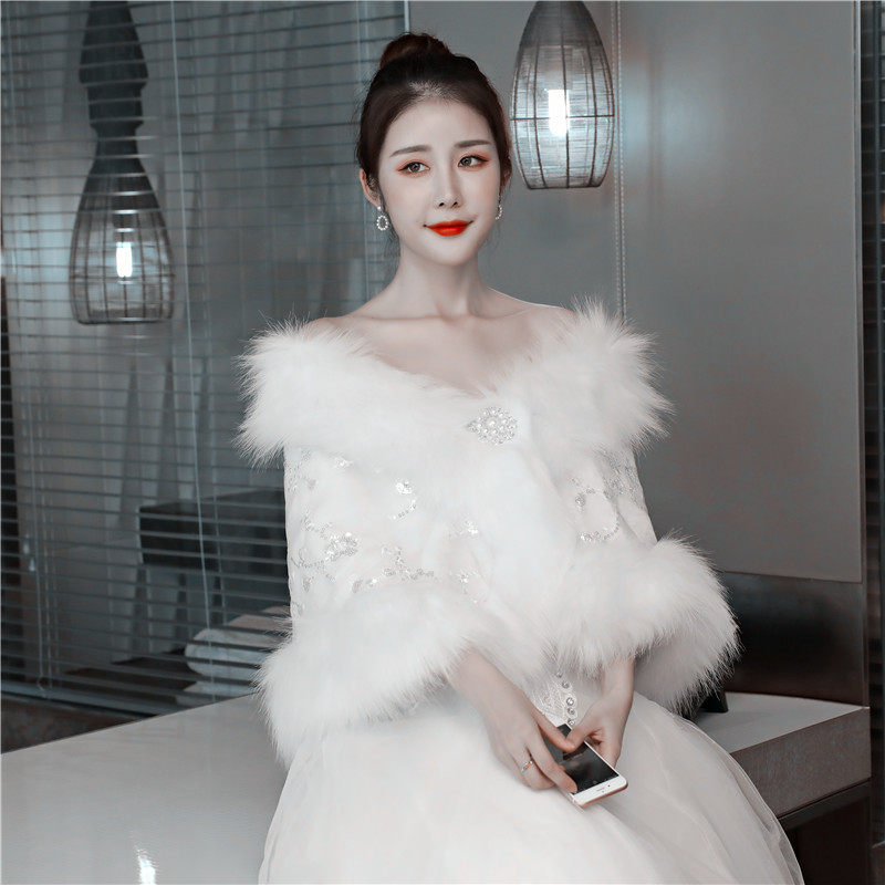 Wedding shawl autumn and winter wedding bride lace sequin wool shawl banquet fox fur large size thickening warm outer wear