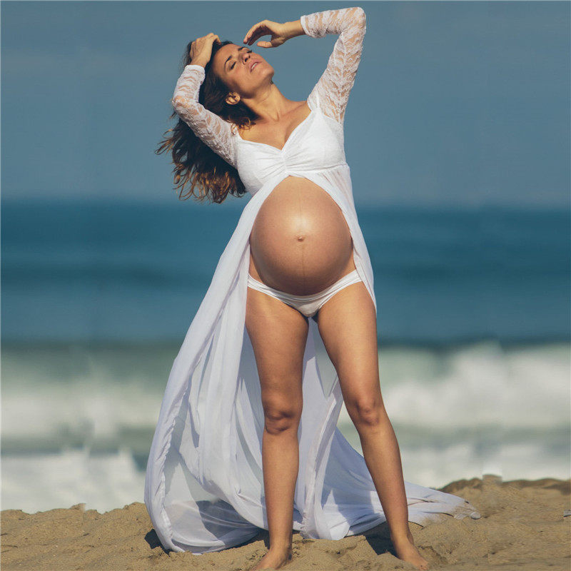 Pregnant women take a picture of the ocean dress