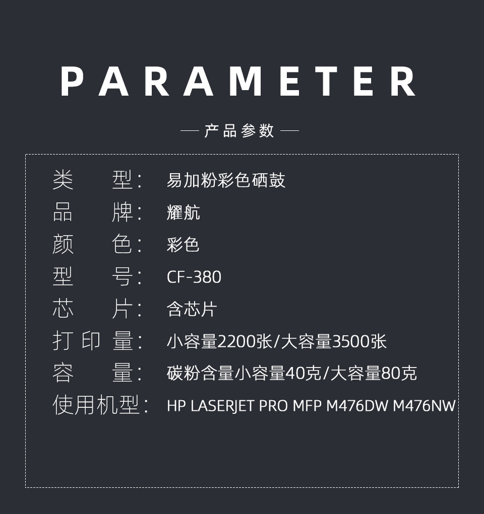 CF380 Black Toner Cartridge (2200 pages) CF380 Blue Toner cartridge (2000 pages) CF380 Yellow Toner cartridge(2000 pages) CF380 Red Toner Cartridge