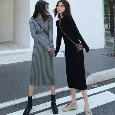 Pregnant women's knitted dress slim stretch stretch skirt V collar Korean sweater autumn and winter base skirt simple maternity tide