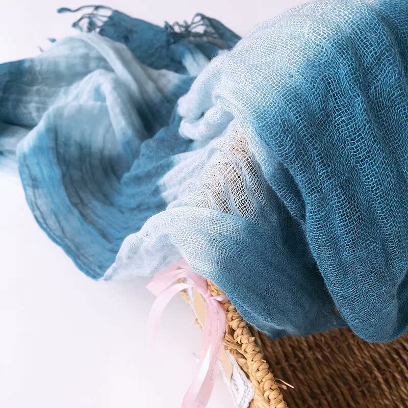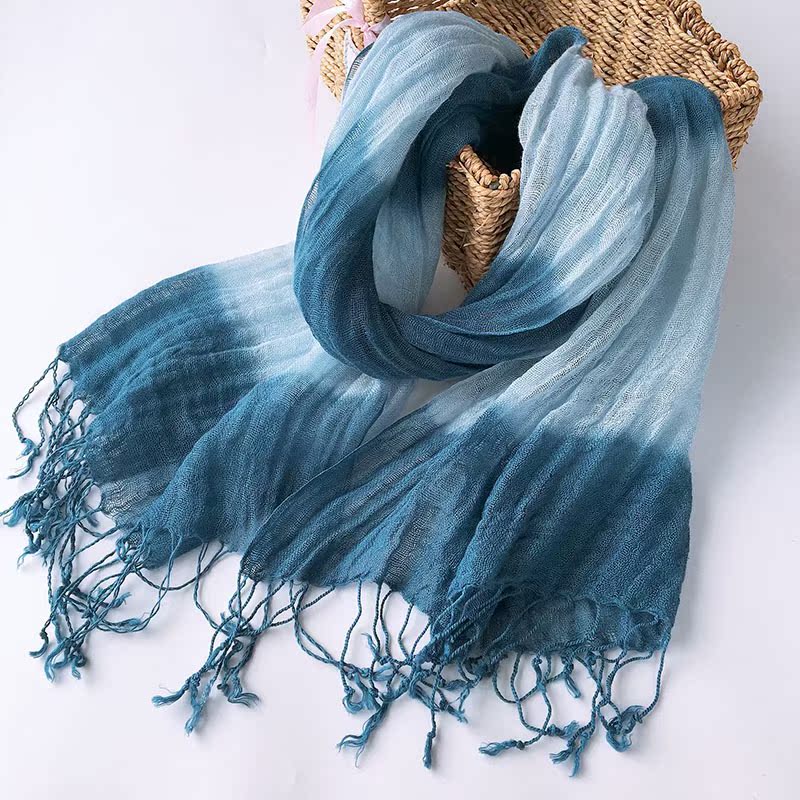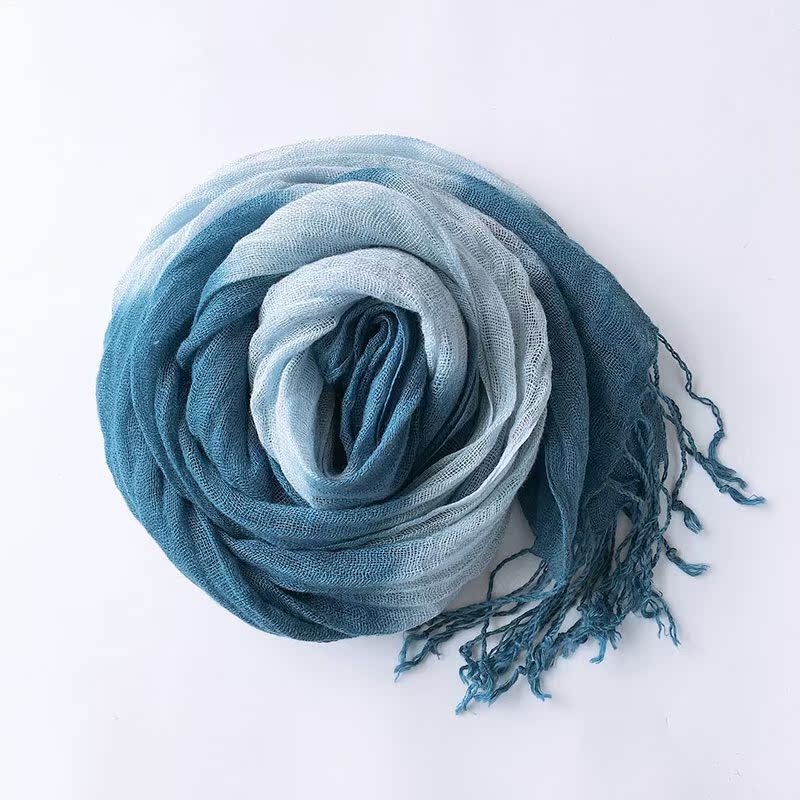 Personality retro Dyeing Gradual Layer Plant Blue Dye Scarf Art Flow Su Long Shawl Linen Thin Silk Scarf Companion Gift