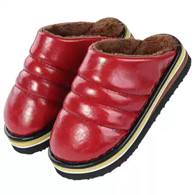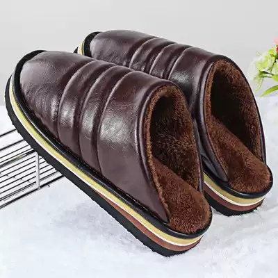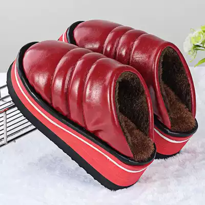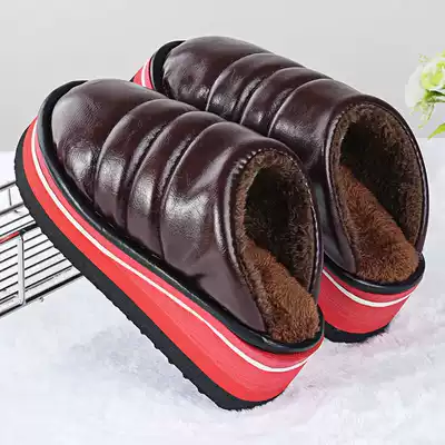 Winter cotton slippers female waterproof thick-soled high-heeled home warm microfiber leather foam-soled cotton slippers men's large size