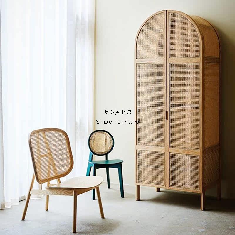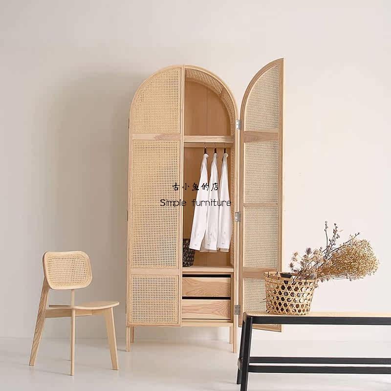 Ancient fish solid wood rattan woven wardrobe Simple solid wood frame bed and breakfast hotel large wardrobe Korean ins wind storage cabinet