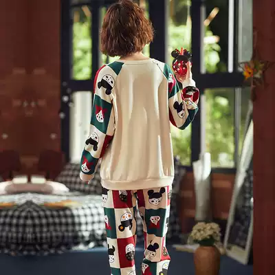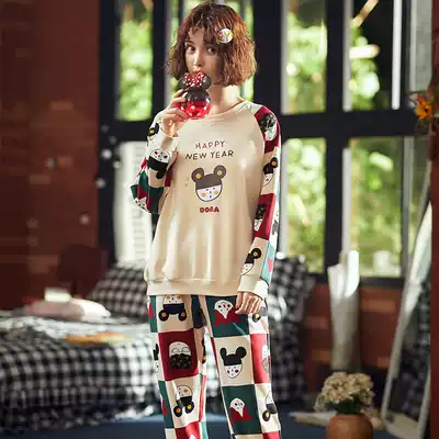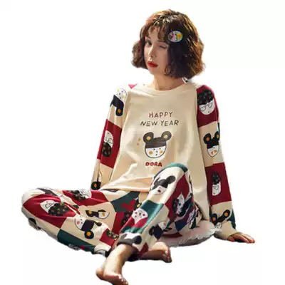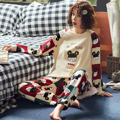 Korean version of long-sleeved pajamas female spring and autumn cotton thin cotton cotton sweet cartoon print can be worn outside home wear suit