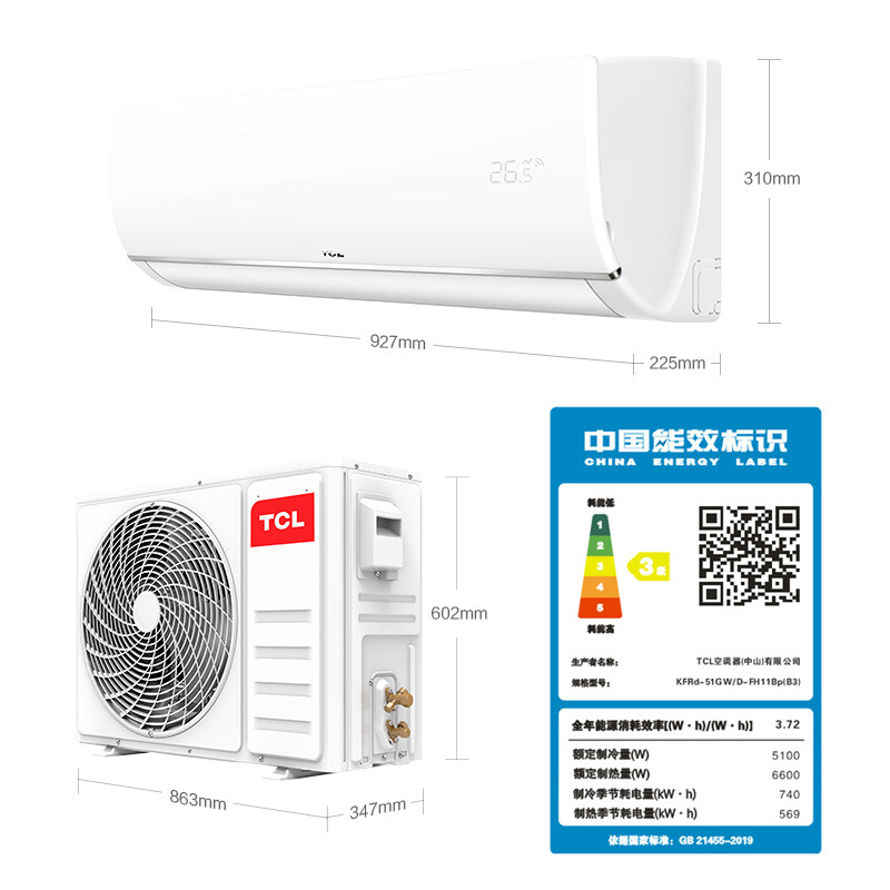 TCL big 2 new three-level energy efficiency wall-mounted intelligent variable frequency air conditioning Wall-mounted air conditioning living room hanging household heating and cooling FH