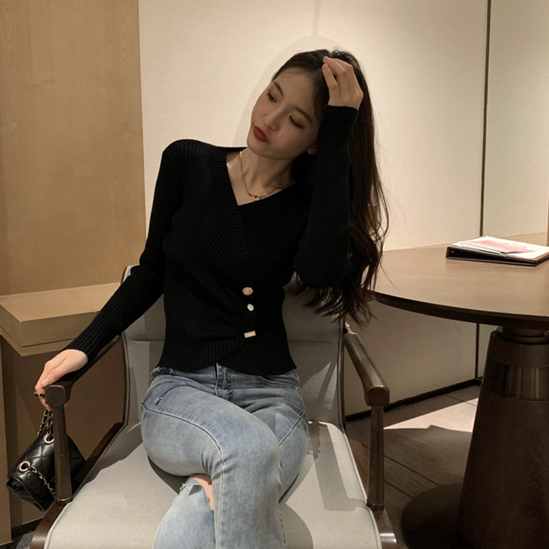 Black base shirt women's inner summer irregular V-neck sweater 2021 new slim knitted top long sleeve