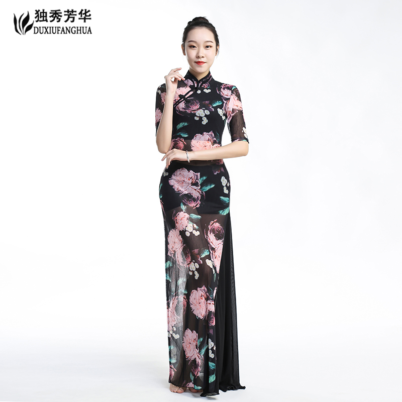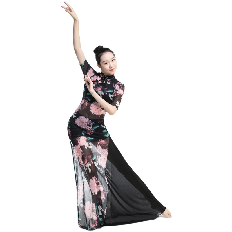 Classical Dance Long Version Qipao Dress Elastic Mesh Yarn Printed China Dance Dress Modern Dance Wear