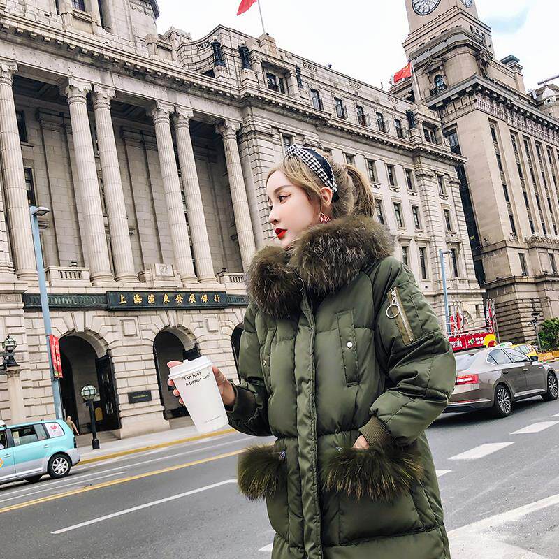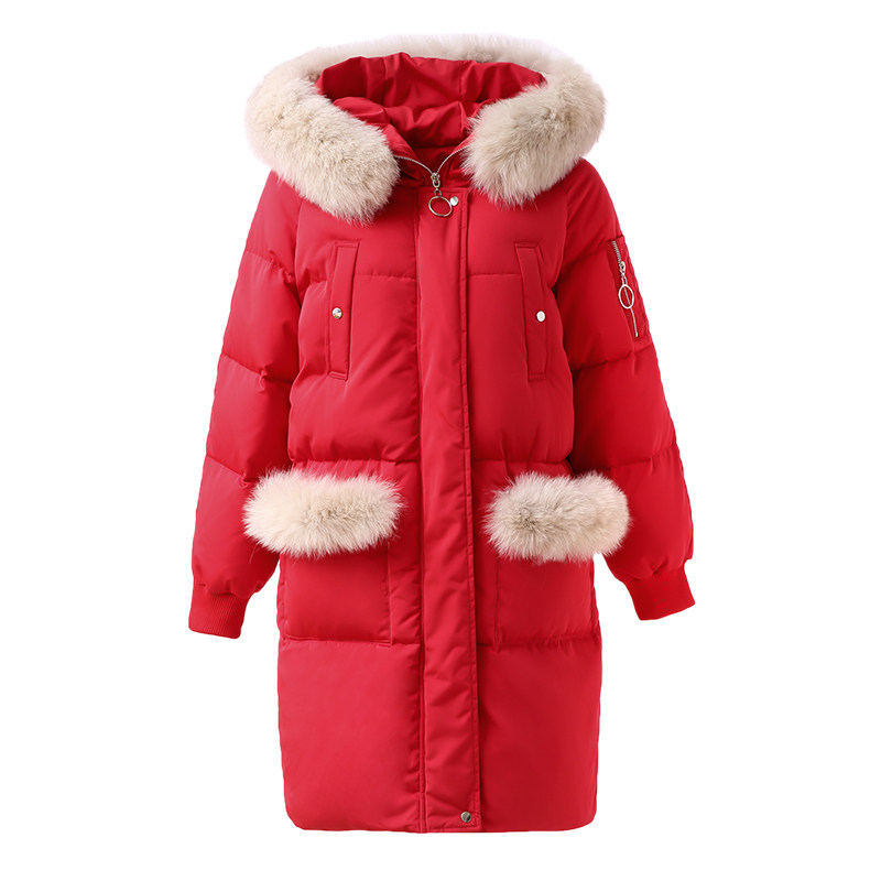 European Standing European Cargo Real Fur Collar Large Size Fat Mm Foreign Pie Duvet Clothing Women Chains Thickened Winter Dress Jacket Mid-Length