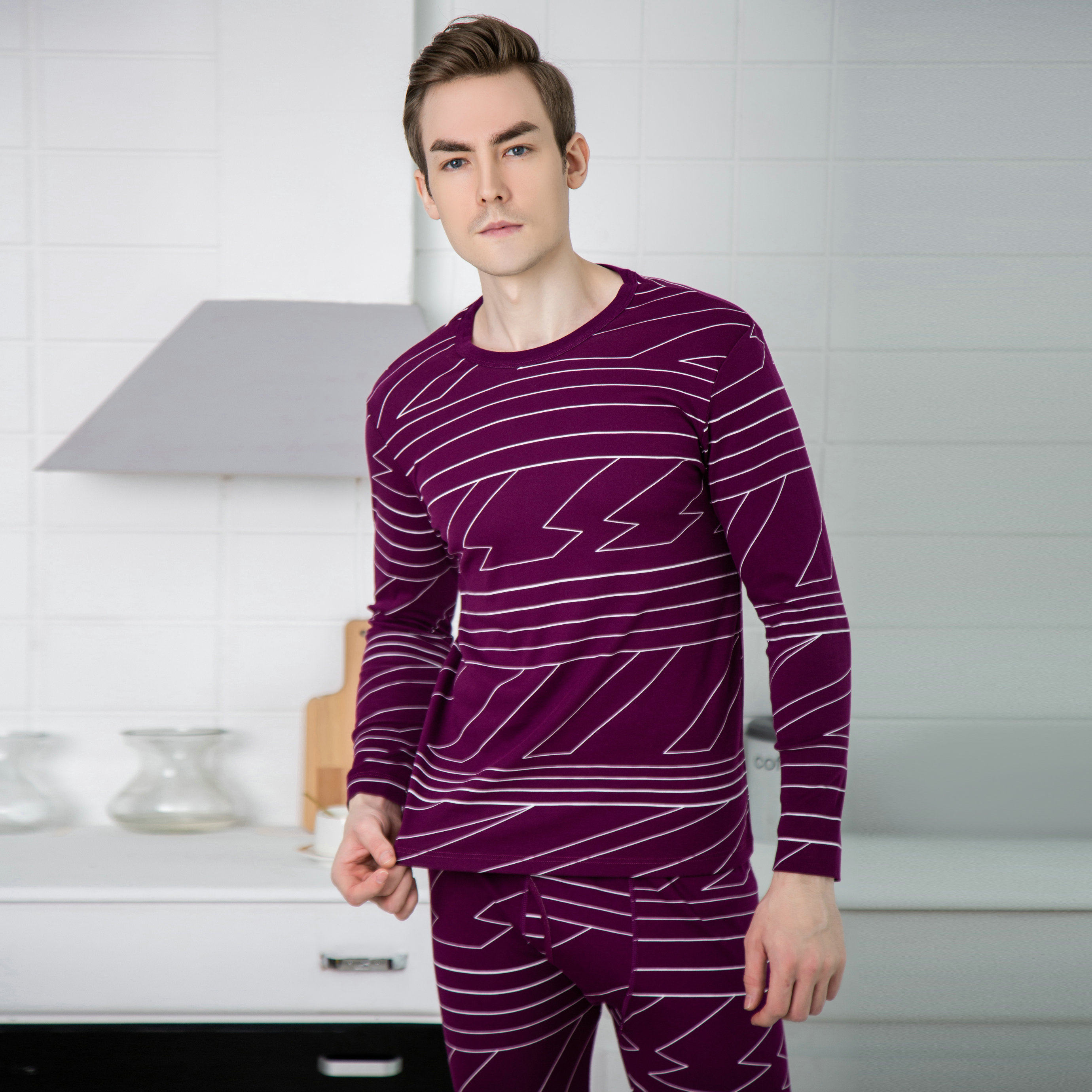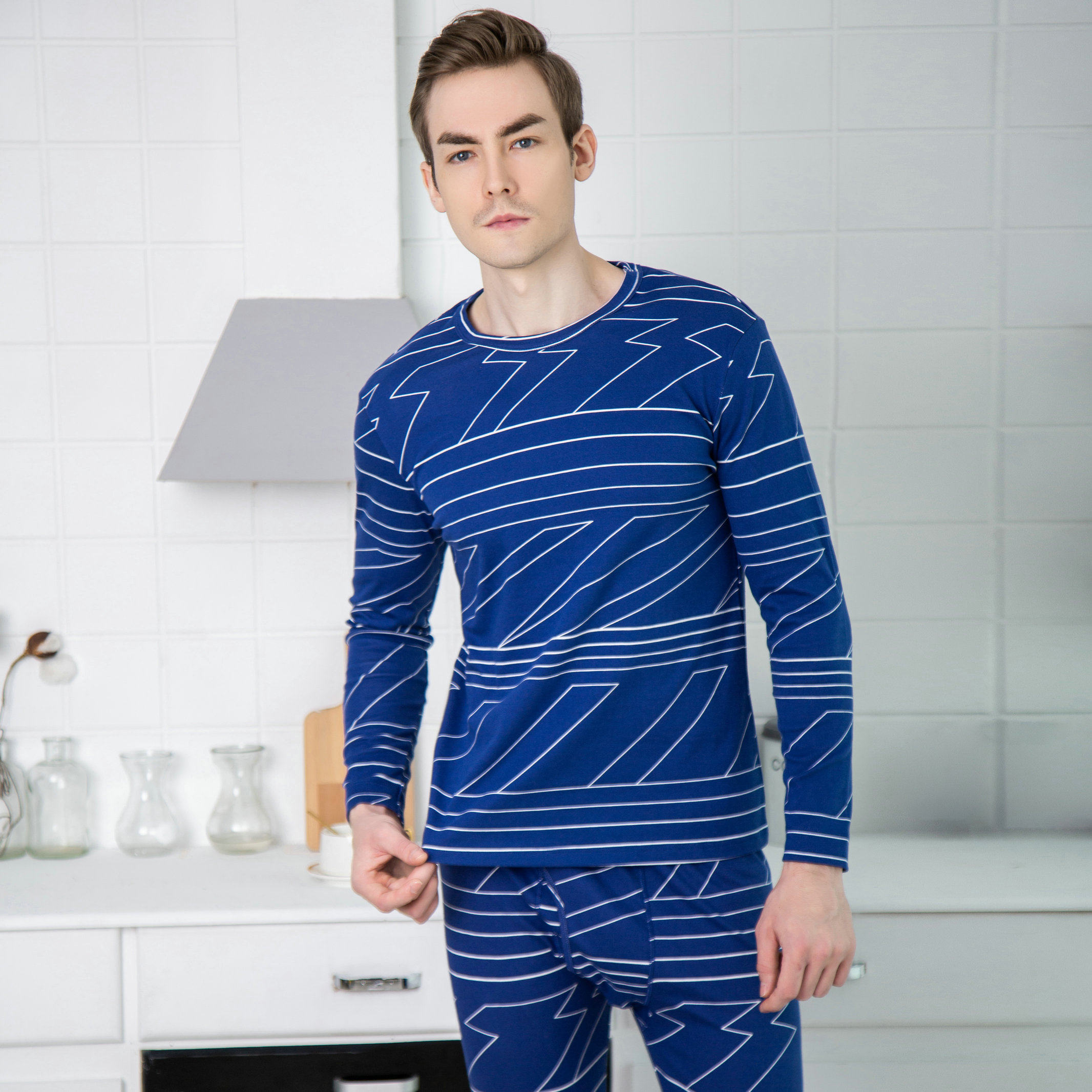 Italian autumn and winter men's pure cotton long johns long johns cotton sweater youth thin bottoming thermal underwear set