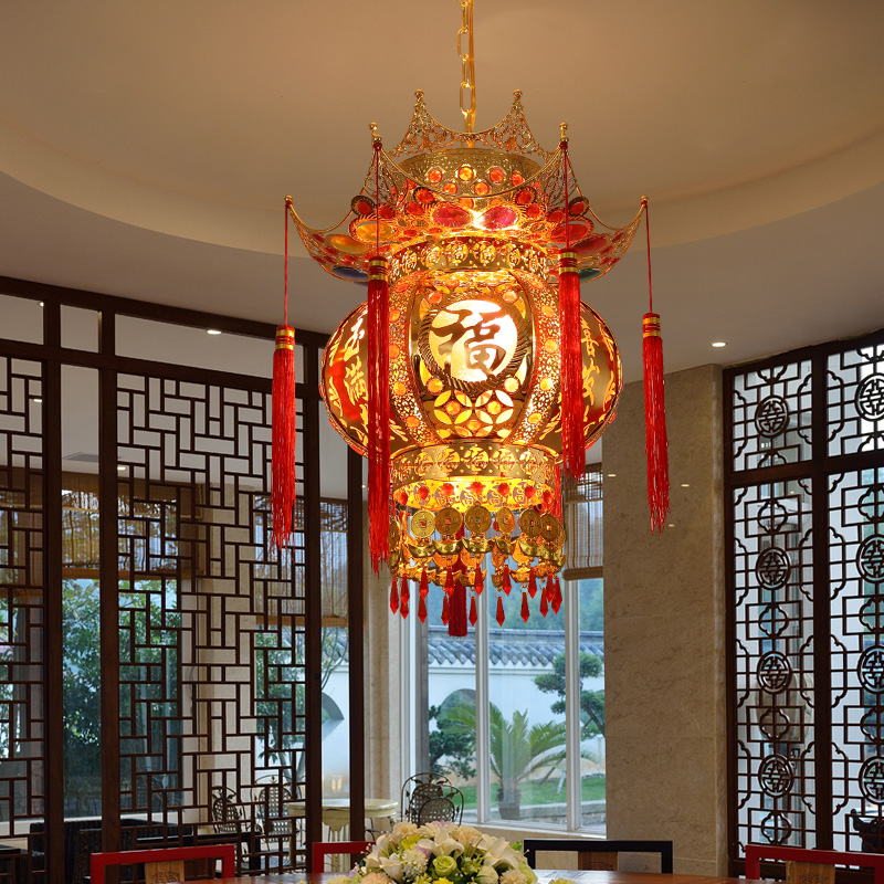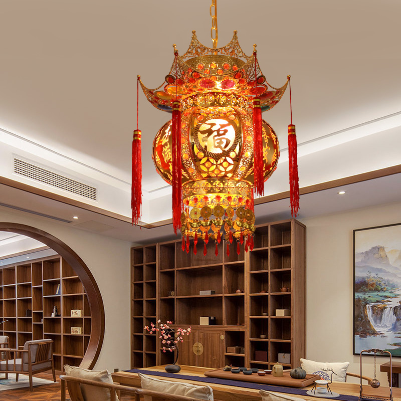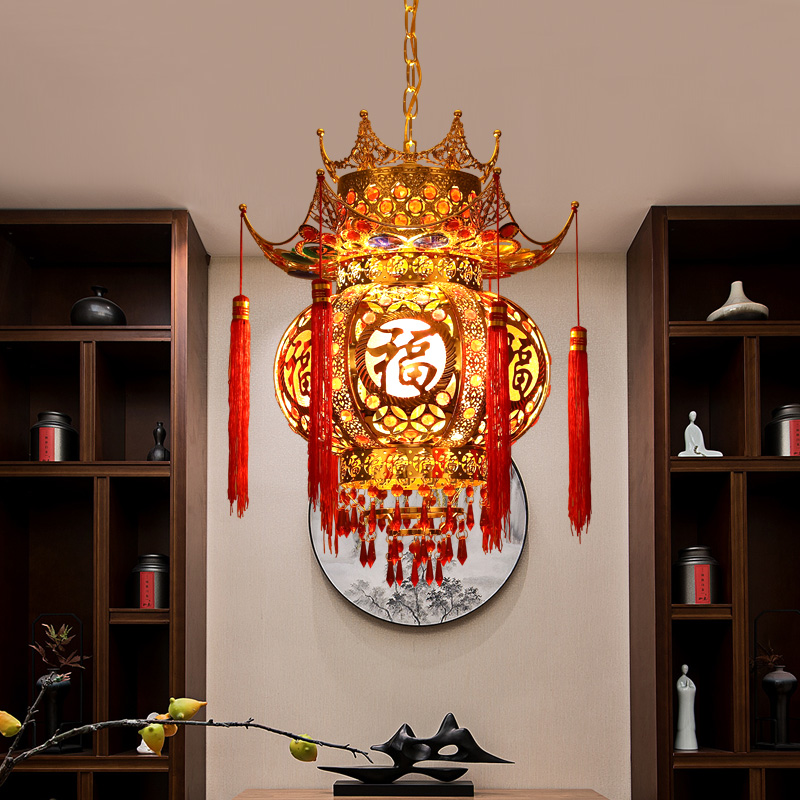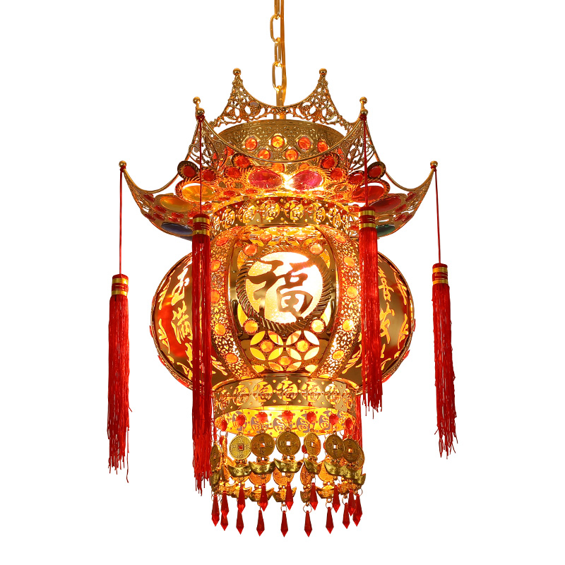 Double Layer Palace Light Meta-Treasure Lantern China Wind Walking Coal Oil Lamp Decoration Hollowed-out Chandelia LED Balcony Swivel Lightening