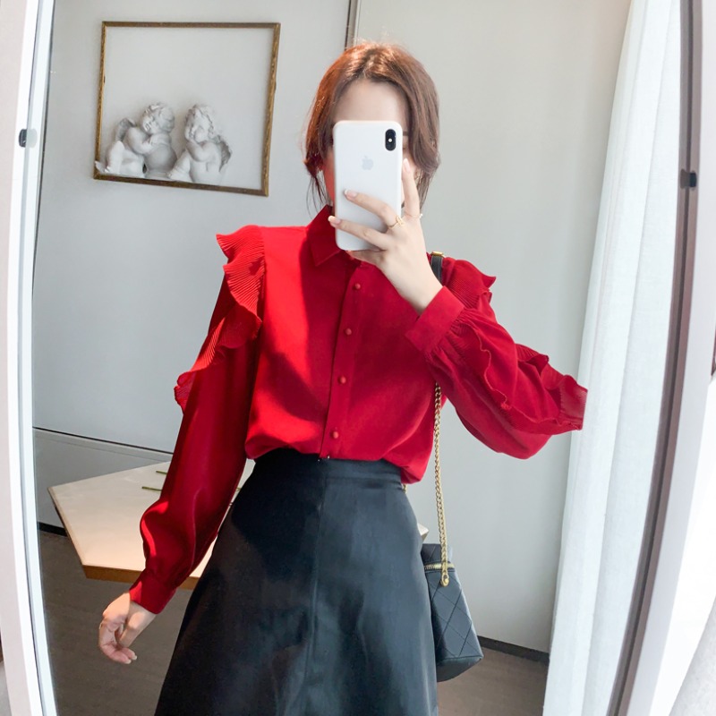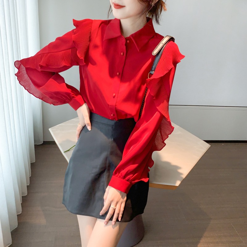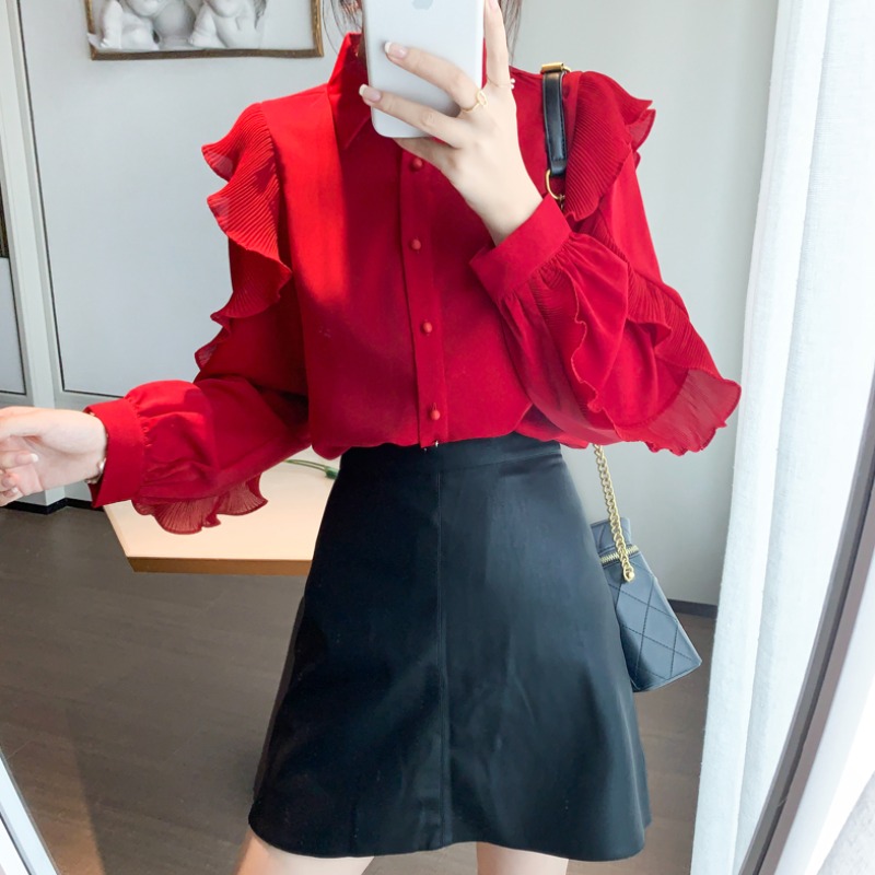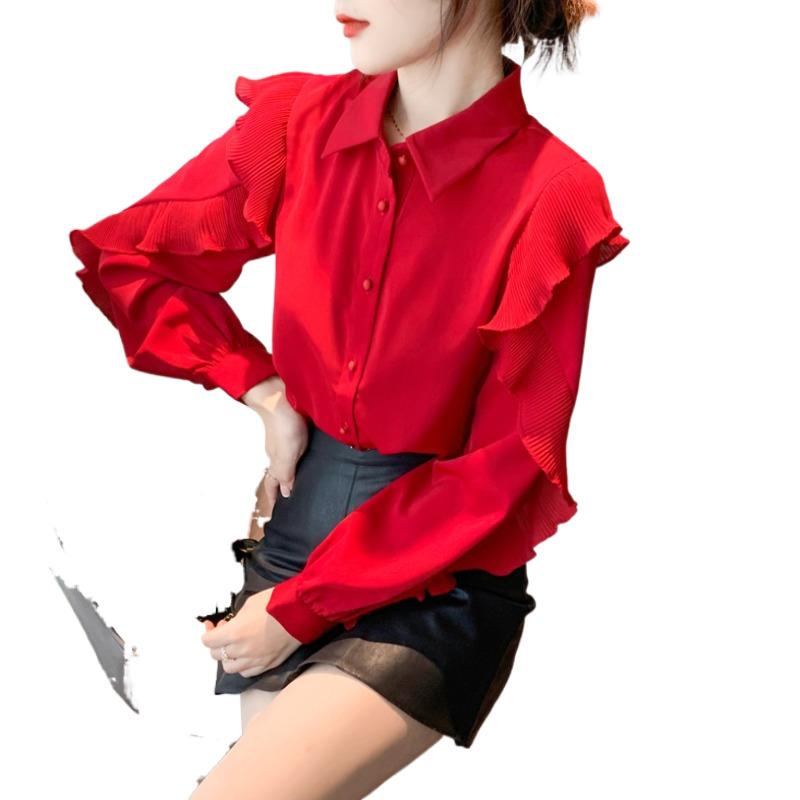 Vanhee 2021 spring new chiffon shirt women's French lantern sleeve top retro women's fashion red shirt