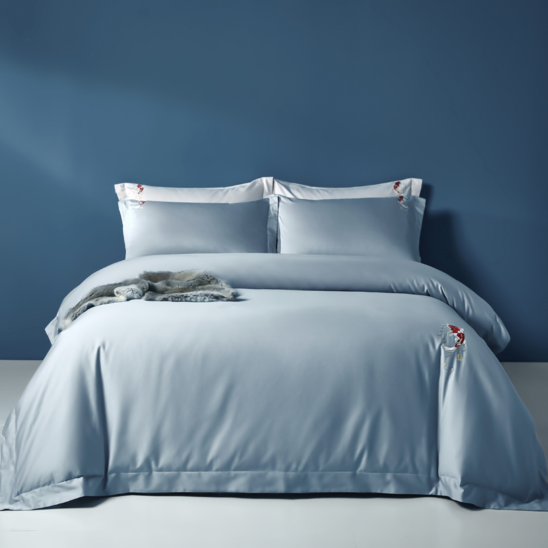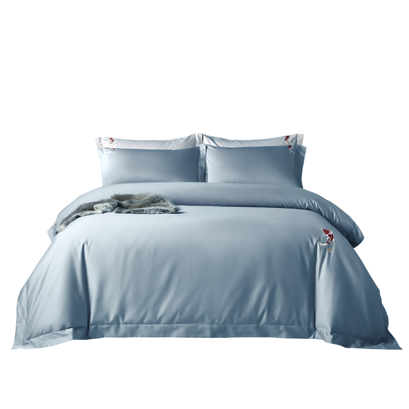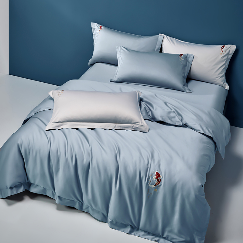 Jin Carp National Tide Roland Home Textile Embroidery Brief New Chinese Spring Autumn Season Long Suede Cotton Pure Cotton Pure Color Blue Four Pieces Sleeves